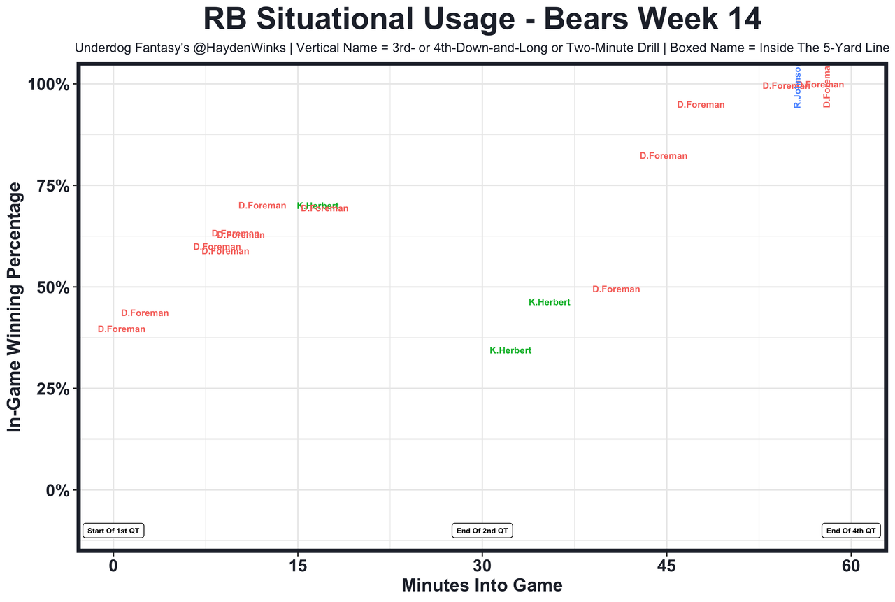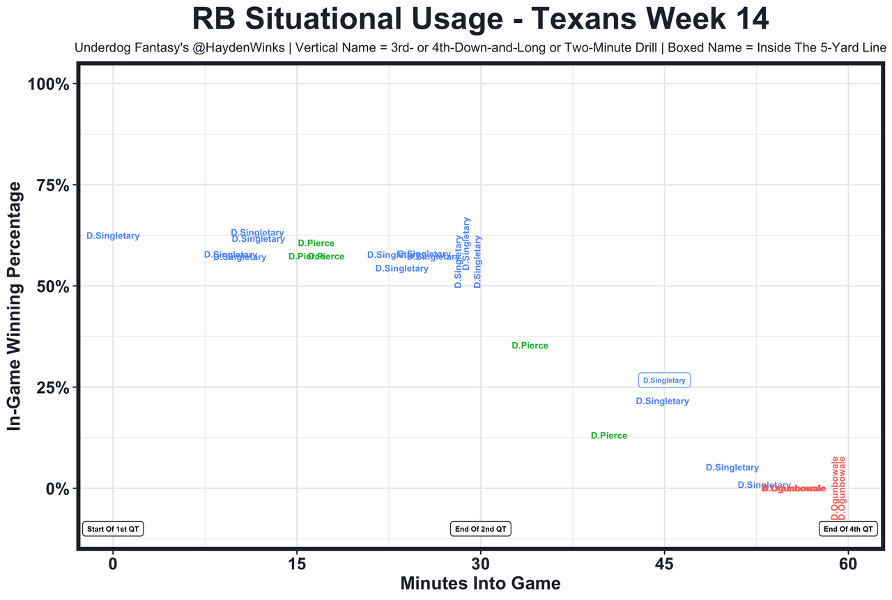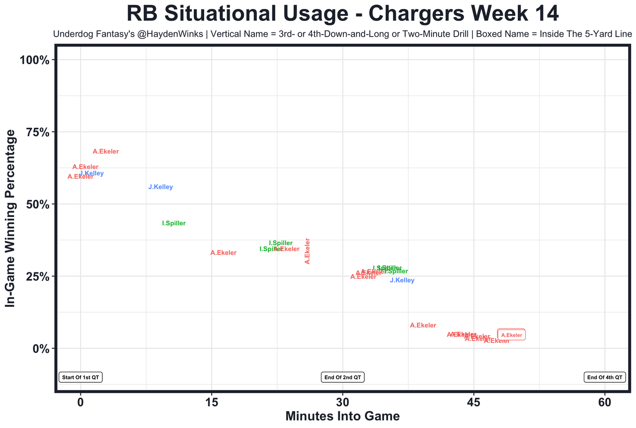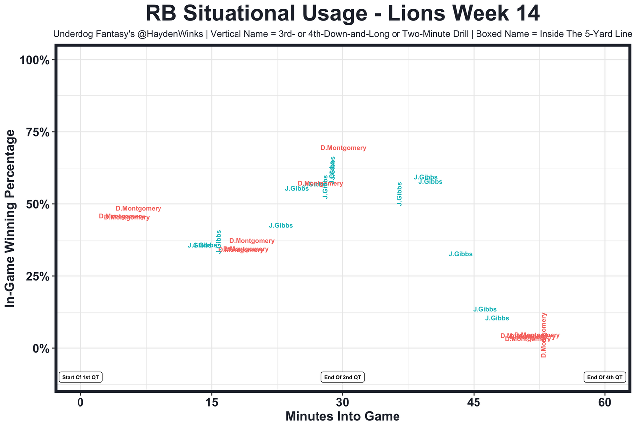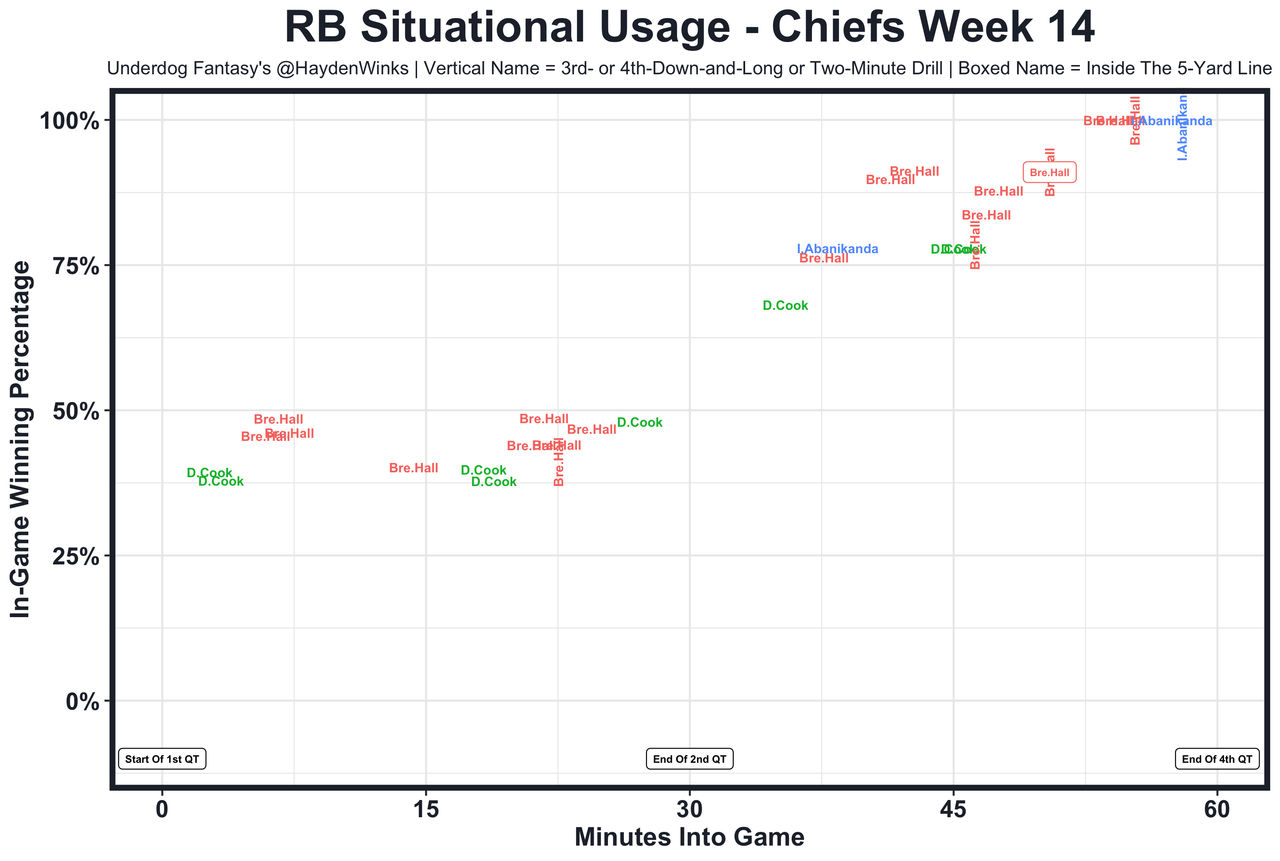 Some quick notes on players: Bijan Robinson is now the Falcons goal line RB ... While very clearly good, Keaton Mitchell is still under 7.0 expected half PPR in every game ... Stefon Diggs hasn't hit 14.0 expected half PPR since Week 7 with the Bills playing more balanced ... Panthers have given up on passing (last in neutral pass rate), rightfully so ... D'Onta Foreman rug-pulled Roschon Johnson ... Amari Cooper and David Njoku are very frisky with the Browns letting Joe Flacco cook (3rd in neutral pass rate) ... Courtland Sutton continues to 360 windmill dunk on my receiving TD model ... Negative game script hurt David Montgomery, especially after Jahmyr Gibbs two long-ish runs early ... Jayden Reed had a season-high 15.4 expected half PPR points without Christian Watson (hamstring). He's also good ... Throw out the Texans game (and perhaps the season if Nico Collins can't play long term) ... Zack Moss had 7.6 half PPR points on *wait for it* 20.2 expected half PPR points, thanks to 8 targets and 2 goal line opportunities. The tilt is real ... The Zay Jones pump up speech was intended for Evan Engram (18.1 expected half PPR), not Calvin Ridley, this week ... Clyde Edwards-Helaire had 10.0 expected half PPR points as a bowling ball, but Jerick McKinnon (7.0) was on the field for the 6-yard TD on a 3rd-and-4 when Mahomes checked into the favorable run look. This is a near even committee right now, with McKinnon probably more likely to ride a "hot hand" ... Rams are 1st in WR fantasy usage and RB fantasy usage. Shoutout Sean McVay and Matthew Stafford. Dawgs ... Austin Ekeler (15.9 expected half PPR points) won the "hot hand battle" after Joshua Kelley and Isaiah Spiller couldn't get it going. Shocking. That, of course, won't matter with Justin Herbert likely out for the season ... We'll see what Zamir White has in the tank, now that contract-year Josh Jacobs picked up an injury. As a reminder, the Raiders were scoreless in Week 14 ... Raheem Mostert is the primary goal line RB, while De'Von Achane was used in the 2-minute drills more often. Both can get there. Mostert likely finishes with more opportunities rest of season ... We witnessed a literal hospital ball from Joshua Dobbs. Justin Jefferson has to be beyond tilted right now, though the Vikings are currently the NFC #6 seed ... Ezekiel Elliott had 20.7 expected half PPR points as a rare 2023 bellcow RB. Dare I say he looks good on tape? ... Alvin Kamara (13.0 expected half PPR) lost work to Gyration King Jamaal Williams ... Wan'Dale Robinson is back in our PPR scamming lives ... Dalvin Cook started, but Breece Hall had the final laugh (15.4 expected half PPR) with Zach Wilson playing his best game of his career in rainy conditions. They passed like crazy ... The Eagles aren't good enough to give D'Andre Swift the very positive game scripts he needs. He has under 11.0 expected half PPR in 4-straight ... The Steelers are unserious until Kenny Pickett returns in 2-3 games ... Zach Charbonnet is a legit problem for Kenneth Walker's usage (9.9 expected half PPR), unless the Seahawks can get back to winning games ... Deebo Samuel looks outrageous (read: healthy) again. The 49ers are quietly 10th in neutral pass rate right now ... The Bucs are 28th in neutral pass rate this month, for some reason ... DeAndre Hopkins is boom-bust, but at least the offense is capable of booms again ...