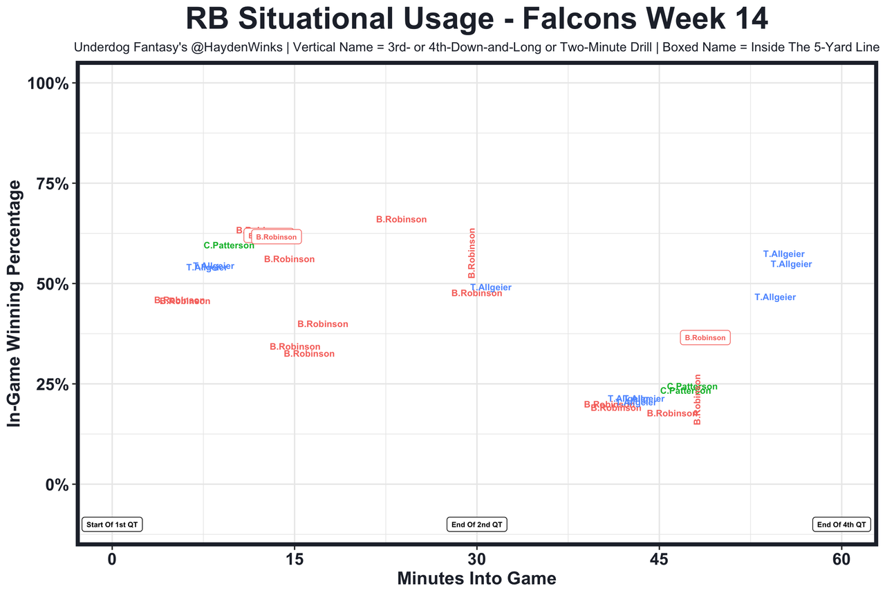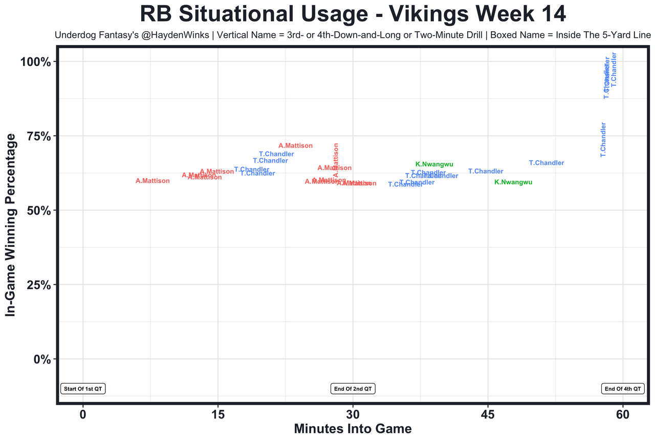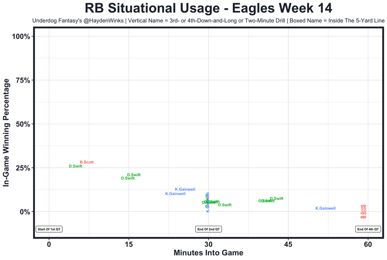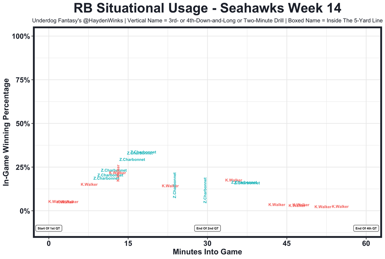 Some quick notes on players: Bijan Robinson is now the Falcons goal line RB ... While very clearly good, Keaton Mitchell is still under 7.0 expected half PPR in every game ... Stefon Diggs hasn't hit 14.0 expected half PPR since Week 7 with the Bills playing more balanced ... Panthers have given up on passing (last in neutral pass rate), rightfully so ... D'Onta Foreman rug-pulled Roschon Johnson ... Amari Cooper and David Njoku are very frisky with the Browns letting Joe Flacco cook (3rd in neutral pass rate) ... Courtland Sutton continues to 360 windmill dunk on my receiving TD model ... Negative game script hurt David Montgomery, especially after Jahmyr Gibbs two long-ish runs early ... Jayden Reed had a season-high 15.4 expected half PPR points without Christian Watson (hamstring). He's also good ... Throw out the Texans game (and perhaps the season if Nico Collins can't play long term) ... Zack Moss had 7.6 half PPR points on *wait for it* 20.2 expected half PPR points, thanks to 8 targets and 2 goal line opportunities. The tilt is real ... The Zay Jones pump up speech was intended for Evan Engram (18.1 expected half PPR), not Calvin Ridley, this week ... Clyde Edwards-Helaire had 10.0 expected half PPR points as a bowling ball, but Jerick McKinnon (7.0) was on the field for the 6-yard TD on a 3rd-and-4 when Mahomes checked into the favorable run look. This is a near even committee right now, with McKinnon probably more likely to ride a "hot hand" ... Rams are 1st in WR fantasy usage and RB fantasy usage. Shoutout Sean McVay and Matthew Stafford. Dawgs ... Austin Ekeler (15.9 expected half PPR points) won the "hot hand battle" after Joshua Kelley and Isaiah Spiller couldn't get it going. Shocking. That, of course, won't matter with Justin Herbert likely out for the season ... We'll see what Zamir White has in the tank, now that contract-year Josh Jacobs picked up an injury. As a reminder, the Raiders were scoreless in Week 14 ... Raheem Mostert is the primary goal line RB, while De'Von Achane was used in the 2-minute drills more often. Both can get there. Mostert likely finishes with more opportunities rest of season ... We witnessed a literal hospital ball from Joshua Dobbs. Justin Jefferson has to be beyond tilted right now, though the Vikings are currently the NFC #6 seed ... Ezekiel Elliott had 20.7 expected half PPR points as a rare 2023 bellcow RB. Dare I say he looks good on tape? ... Alvin Kamara (13.0 expected half PPR) lost work to Gyration King Jamaal Williams ... Wan'Dale Robinson is back in our PPR scamming lives ... Dalvin Cook started, but Breece Hall had the final laugh (15.4 expected half PPR) with Zach Wilson playing his best game of his career in rainy conditions. They passed like crazy ... The Eagles aren't good enough to give D'Andre Swift the very positive game scripts he needs. He has under 11.0 expected half PPR in 4-straight ... The Steelers are unserious until Kenny Pickett returns in 2-3 games ... Zach Charbonnet is a legit problem for Kenneth Walker's usage (9.9 expected half PPR), unless the Seahawks can get back to winning games ... Deebo Samuel looks outrageous (read: healthy) again. The 49ers are quietly 10th in neutral pass rate right now ... The Bucs are 28th in neutral pass rate this month, for some reason ... DeAndre Hopkins is boom-bust, but at least the offense is capable of booms again ...