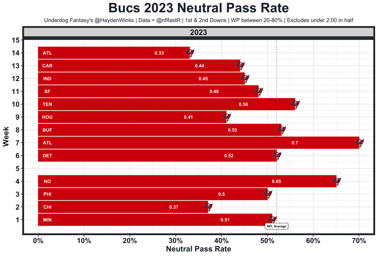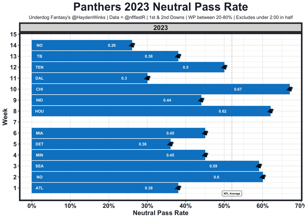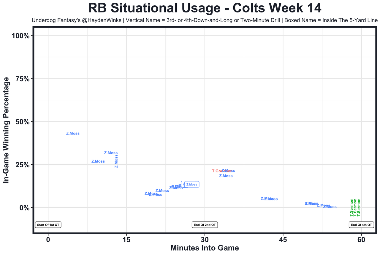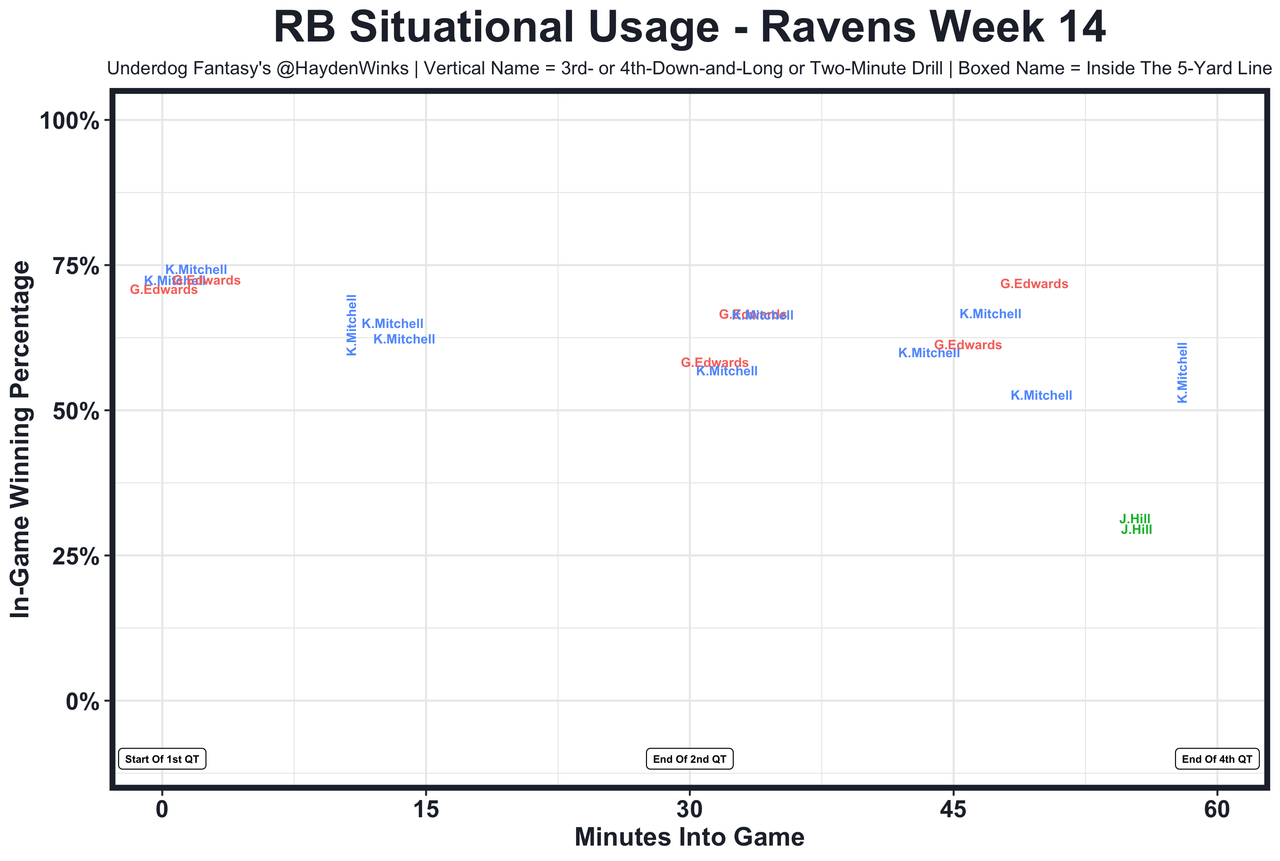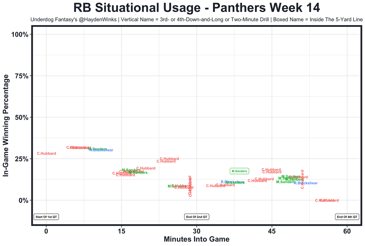 Some quick notes on players: Bijan Robinson is now the Falcons goal line RB ... While very clearly good, Keaton Mitchell is still under 7.0 expected half PPR in every game ... Stefon Diggs hasn't hit 14.0 expected half PPR since Week 7 with the Bills playing more balanced ... Panthers have given up on passing (last in neutral pass rate), rightfully so ... D'Onta Foreman rug-pulled Roschon Johnson ... Amari Cooper and David Njoku are very frisky with the Browns letting Joe Flacco cook (3rd in neutral pass rate) ... Courtland Sutton continues to 360 windmill dunk on my receiving TD model ... Negative game script hurt David Montgomery, especially after Jahmyr Gibbs two long-ish runs early ... Jayden Reed had a season-high 15.4 expected half PPR points without Christian Watson (hamstring). He's also good ... Throw out the Texans game (and perhaps the season if Nico Collins can't play long term) ... Zack Moss had 7.6 half PPR points on *wait for it* 20.2 expected half PPR points, thanks to 8 targets and 2 goal line opportunities. The tilt is real ... The Zay Jones pump up speech was intended for Evan Engram (18.1 expected half PPR), not Calvin Ridley, this week ... Clyde Edwards-Helaire had 10.0 expected half PPR points as a bowling ball, but Jerick McKinnon (7.0) was on the field for the 6-yard TD on a 3rd-and-4 when Mahomes checked into the favorable run look. This is a near even committee right now, with McKinnon probably more likely to ride a "hot hand" ... Rams are 1st in WR fantasy usage and RB fantasy usage. Shoutout Sean McVay and Matthew Stafford. Dawgs ... Austin Ekeler (15.9 expected half PPR points) won the "hot hand battle" after Joshua Kelley and Isaiah Spiller couldn't get it going. Shocking. That, of course, won't matter with Justin Herbert likely out for the season ... We'll see what Zamir White has in the tank, now that contract-year Josh Jacobs picked up an injury. As a reminder, the Raiders were scoreless in Week 14 ... Raheem Mostert is the primary goal line RB, while De'Von Achane was used in the 2-minute drills more often. Both can get there. Mostert likely finishes with more opportunities rest of season ... We witnessed a literal hospital ball from Joshua Dobbs. Justin Jefferson has to be beyond tilted right now, though the Vikings are currently the NFC #6 seed ... Ezekiel Elliott had 20.7 expected half PPR points as a rare 2023 bellcow RB. Dare I say he looks good on tape? ... Alvin Kamara (13.0 expected half PPR) lost work to Gyration King Jamaal Williams ... Wan'Dale Robinson is back in our PPR scamming lives ... Dalvin Cook started, but Breece Hall had the final laugh (15.4 expected half PPR) with Zach Wilson playing his best game of his career in rainy conditions. They passed like crazy ... The Eagles aren't good enough to give D'Andre Swift the very positive game scripts he needs. He has under 11.0 expected half PPR in 4-straight ... The Steelers are unserious until Kenny Pickett returns in 2-3 games ... Zach Charbonnet is a legit problem for Kenneth Walker's usage (9.9 expected half PPR), unless the Seahawks can get back to winning games ... Deebo Samuel looks outrageous (read: healthy) again. The 49ers are quietly 10th in neutral pass rate right now ... The Bucs are 28th in neutral pass rate this month, for some reason ... DeAndre Hopkins is boom-bust, but at least the offense is capable of booms again ...