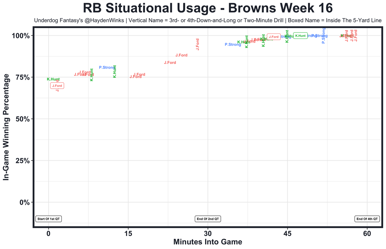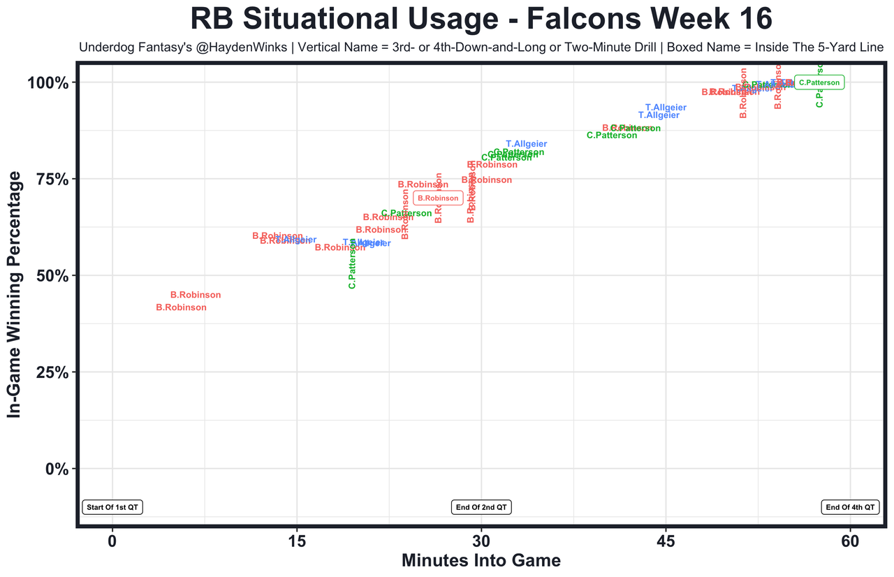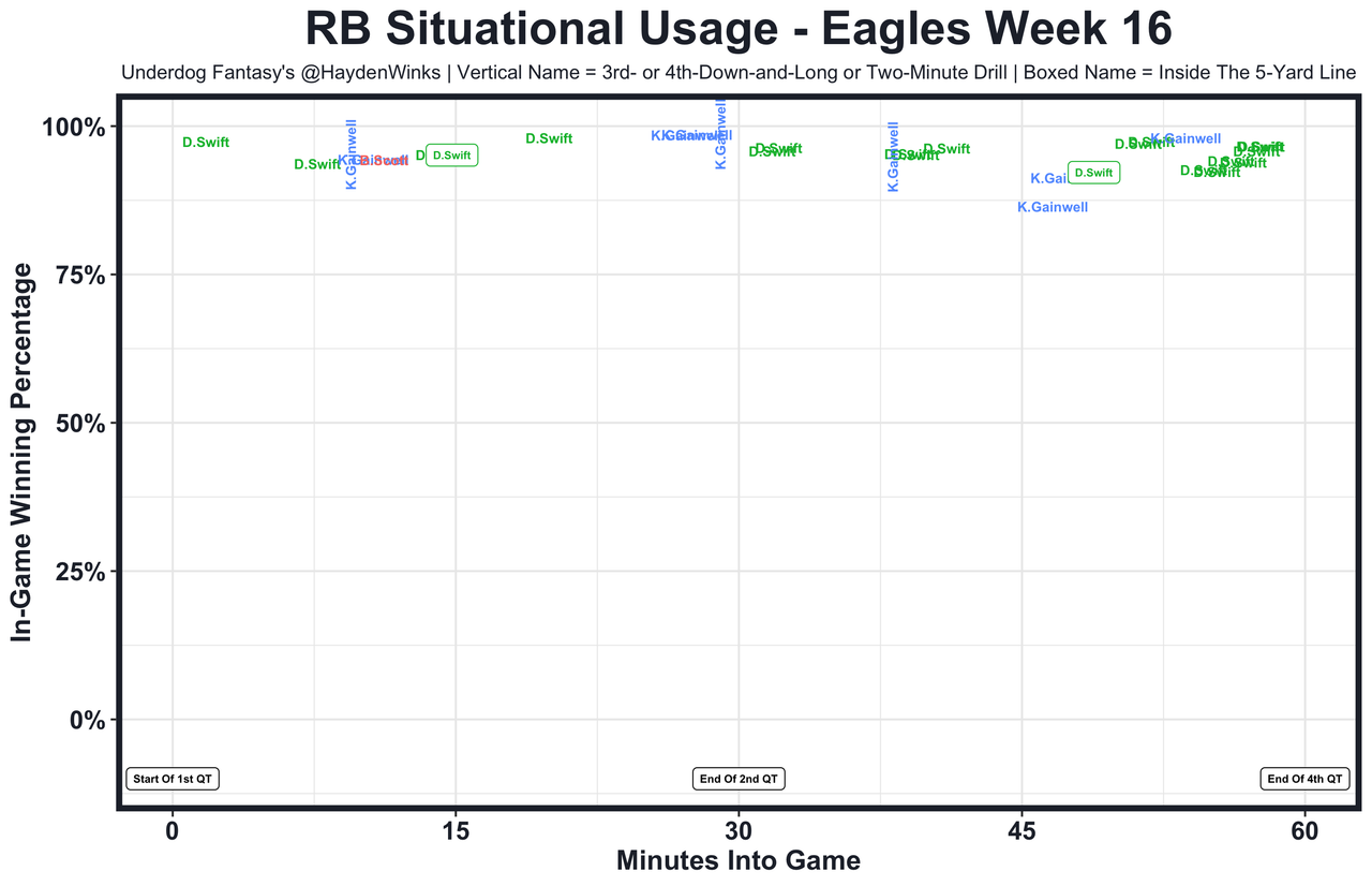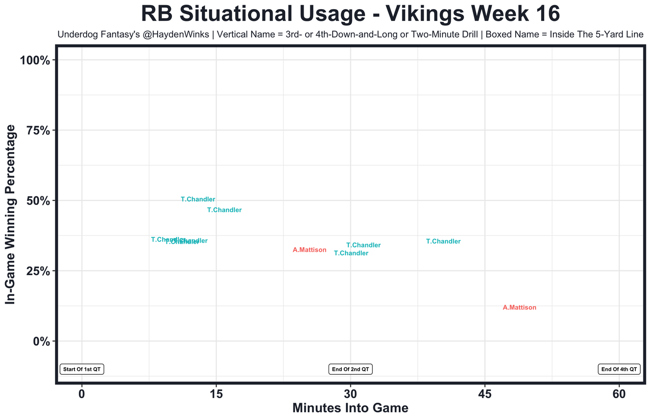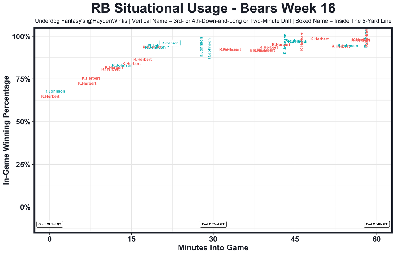 Aaron Jones has 17.7 and 20.2 expected half PPR points since returning from injury. One day that will really pay off (we can hope) ... Ezekiel Elliott is the RB13 on RB4 usage this month. Adjust the rankings, unless Rhamondre Stevenson is cleared this week ... Tony Pollard is too smol to be a featured back. Both legs and his full ass crossed the goal line, yet he couldn't get the ball in. What a disappointing season for the pending free agent. Pollard is the RB27 on RB14 usage this month. It's been like that for much of the season ... Bijan Robinson had a season-high 22.4 expected half PPR points after busting last week. Fantasy is pain, but we love it ... The workload was there for Devin Singletary (he was subbed out in the 3rd quarter due to scoreboard), but he simply needs CJ Stroud in the lineup to really feel comfortable as an upside RB2. That looks like the case heading into the finals, however ... Ty Chandler played 65% snaps and scored a goal-line TD to save his day, but the Vikings are 32nd in RB usage this month. He had just 7.2 expected half PPR points ... Gus Edwards has 16.2 and 10.6 expected half PPR points in his last two games without Keaton Mitchell stealing early-down work. He's back in our RB2-3 lives ... With D'Onta Foreman (personal) out, it was Khalil Herbert over Roschon Johnson on early downs. Herbert had 14.3 expected half PPR points even with the rookie stealing an inside the 5-yard line opportunity and the 2-minute drill.