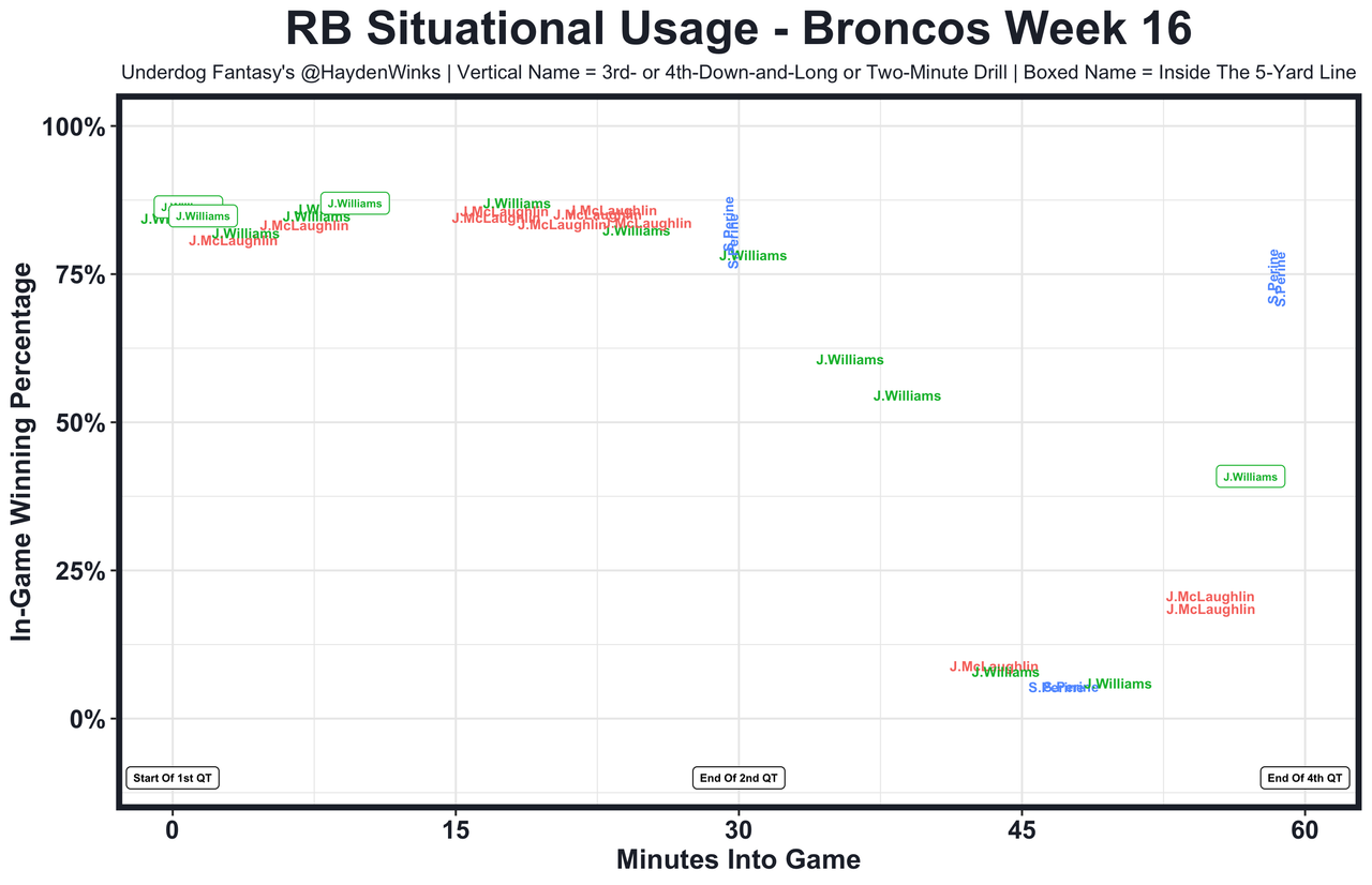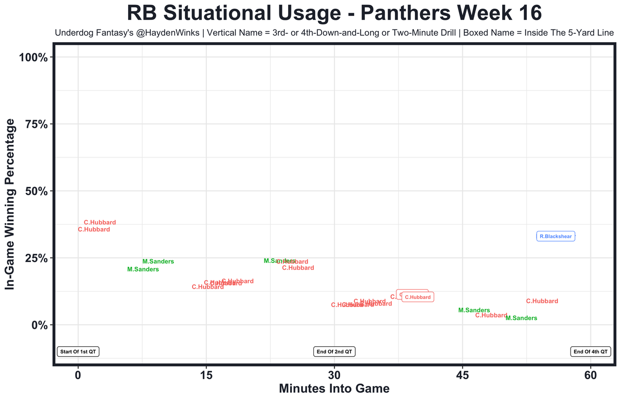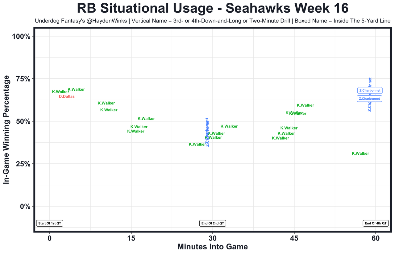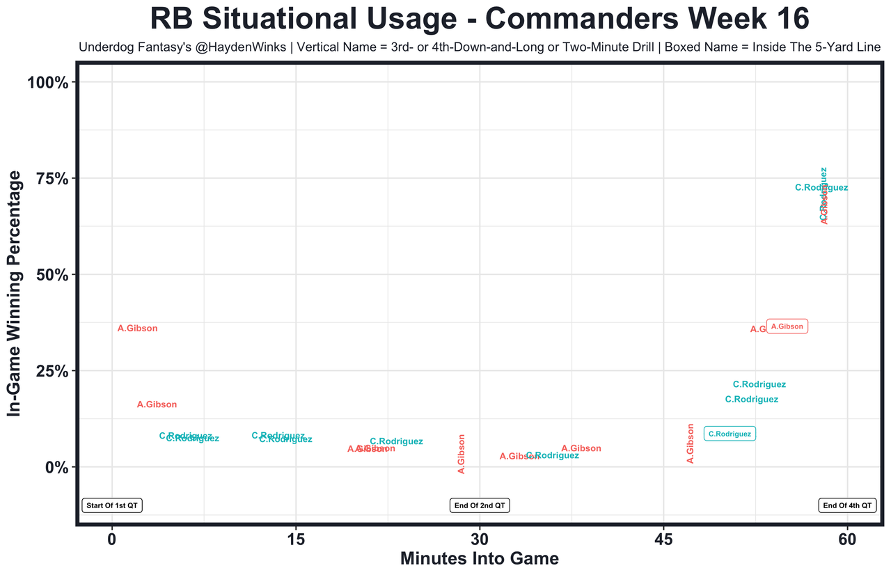 The Lions are 5th in RB usage this month, so both Jahmyr Gibbs (RB7 on RB20 usage) and David Montgomery (RB18 on RB20) are viable upside options. It was Gibbs in Week 16 with the monster performance, but there is some context as you'll see in the chart down the page. Montgomery was feasting early and then left in the concussion protocol. During that time, Gibbs went nuts and finished a drive with an inside the 5-yard line score. Maybe that would've happened anyway, but Montgomery was going to go off if he didn't miss the time he did. Thankfully he was able to return with 10 minutes to go in the game. How could you not love this tandem right now?