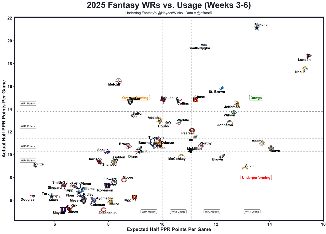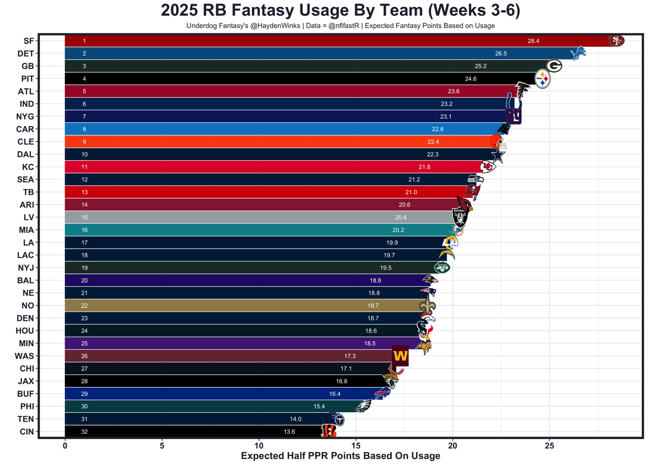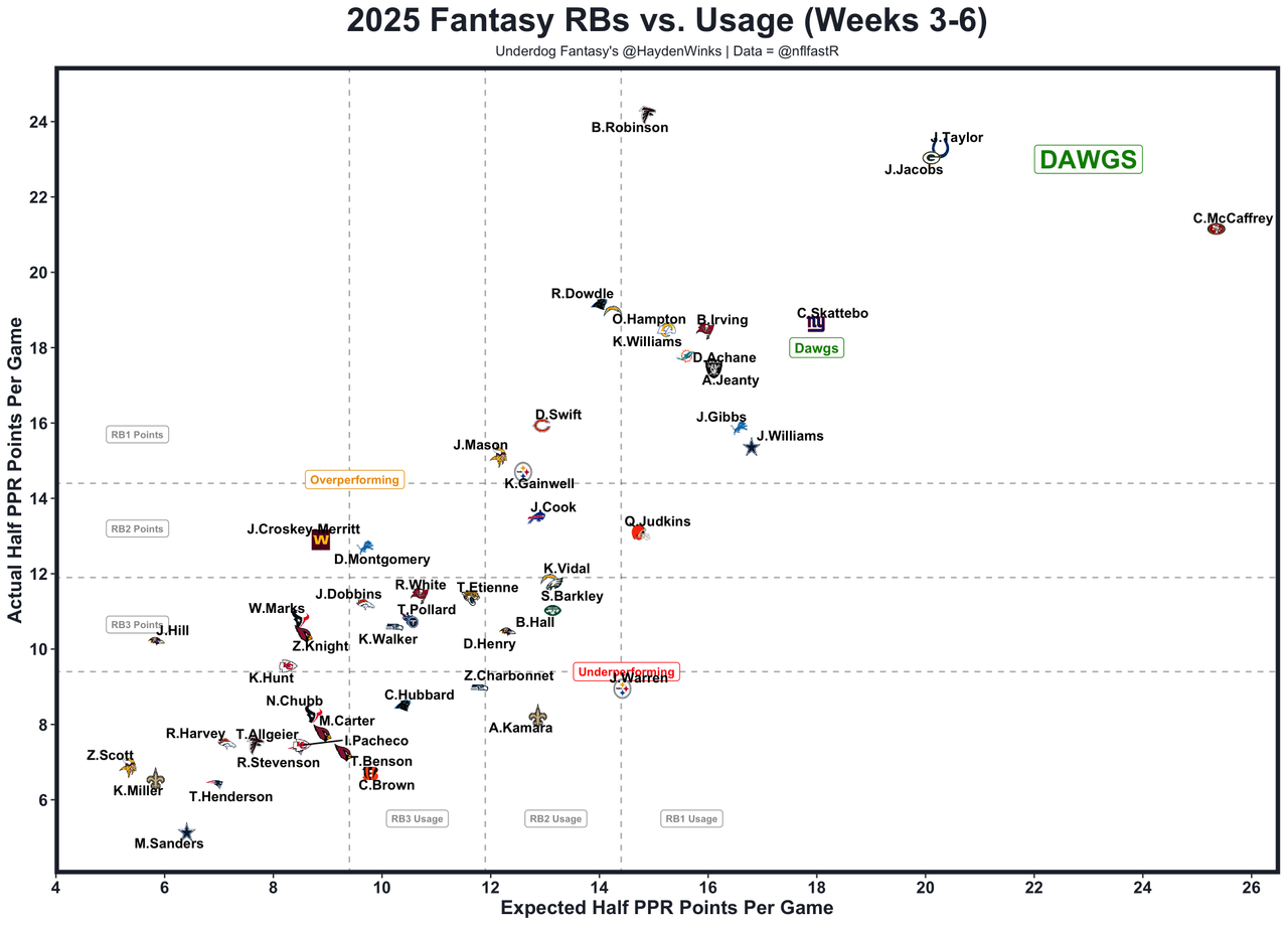 Posted every Tuesday, The Fantasy Usage Model combines my expected fantasy points model with his film notes to recap the previous week's game. An explanation of this is here, but it basically turns targets, carries, air yards, goal line touches, and other variables into expected fantasy points. We have the sickest fantasy show ever on Tuesday nights going over this column. If you have time for 1 hour of fantasy content, make it this one.