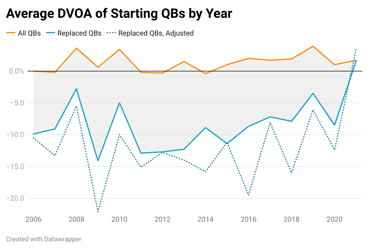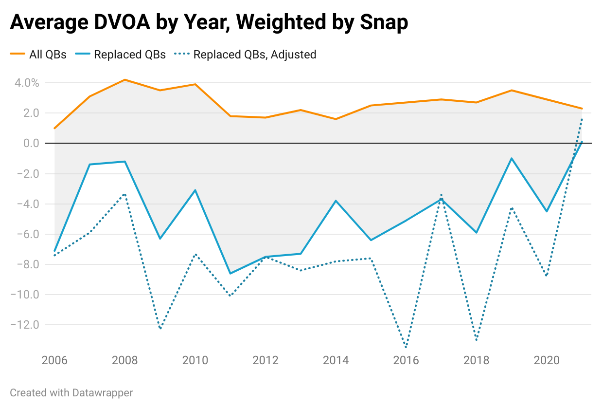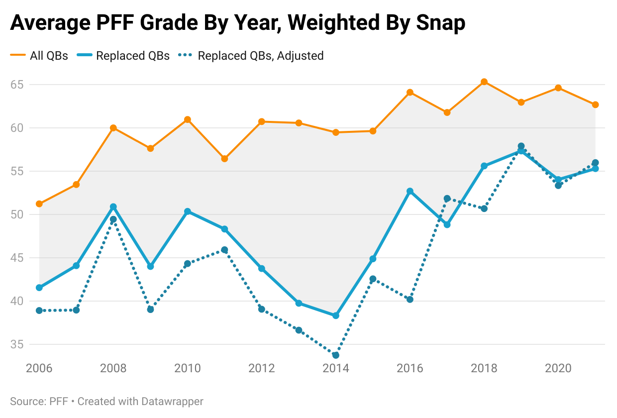 The Adjusted Replacements line, in a dotted dark blue, is decidedly lower than Replaced QBs, as is to be expected. The gap still narrows across the board: from 13.85% to 9.90% for DVOA, 8.72 to 7.01 for PFF Grade, and 0.099 to 0.061 for EPA/Play. That 2021 season certainly helps raise the average through the final four years. Adjusted Replacements leapfrogs Replacement QBs on all three graphs and even manages to eclipse All QBs in DVOA and EPA/Play.