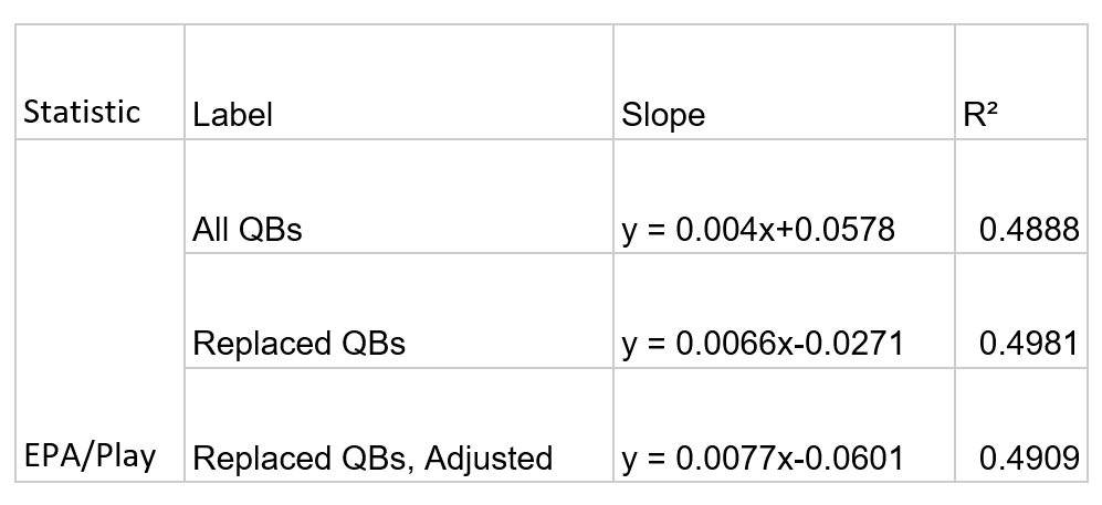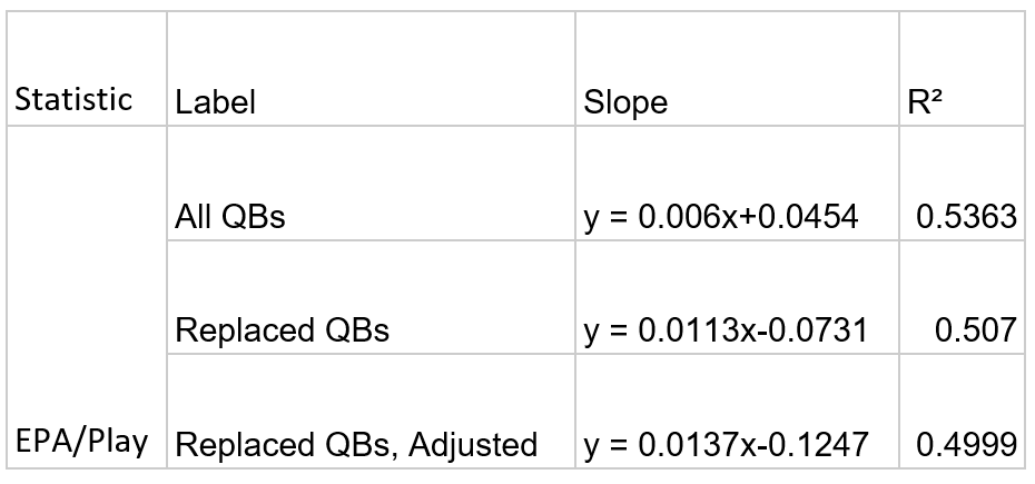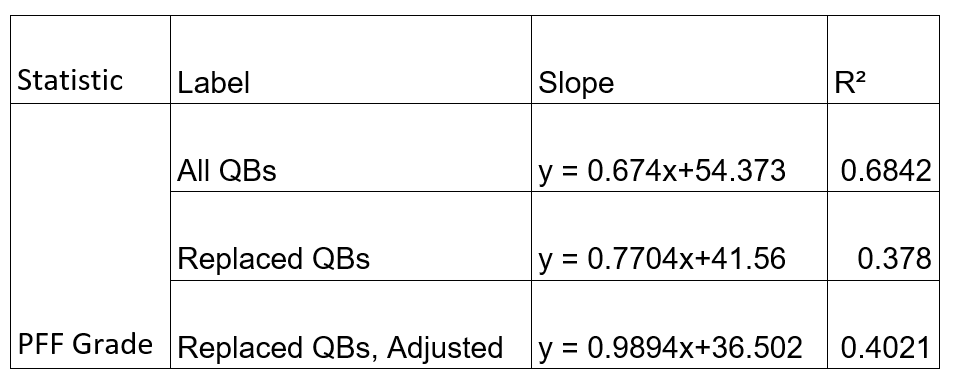In all three cases, the Replaced QBs and Adjusted Replacements have upward-trending slopes that outpace the growth of All QBs and solid correlation across both EPA/Play and PFF Grade charts. The correlation across the board on both charts is extremely encouraging. These R²s that hover around 0.5 tell us that there are definitely some other variables playing a part in this outcome. With 22 players on the field at a given time across 32 teams, one would hope to have some noise in their data. This solid of a correlation, though, tells us that time accounts for a meaningful amount of this progression. Replaced quarterbacks are getting better over time, and they are improving faster than the rate all quarterbacks are improving at.