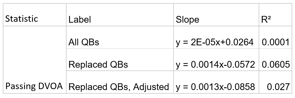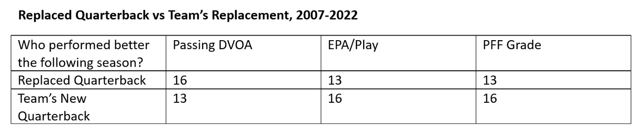 There is only one time where both EPA/Play and PFF Grade disagreed with DVOA: in 2021, when the Philadelphia Eagles replaced Carson Wentz with Jalen Hurts. Hurts was a weak passer with a very poor receiving corps around him; a stat solely focused on passing would not favor the run-heavy quarterback in his first season starting. However, that is really the only time the “passing” part of Passing DVOA has resulted in an outlier piece of data. In all other instances where replaced quarterbacks win out, at least one other statistic agrees.