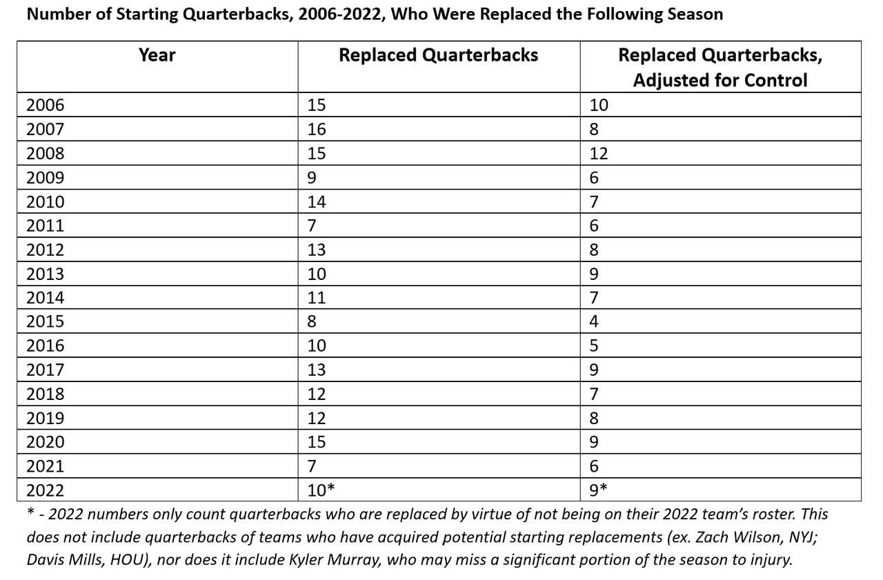 * - 2022 numbers only count quarterbacks who are replaced by virtue of not being on their 2022 team’s roster. This does not include quarterbacks of teams who have acquired potential starting replacements (ex. Zach Wilson, NYJ; Davis Mills, HOU), nor does it include Kyler Murray, who may miss a significant portion of the season to injury.