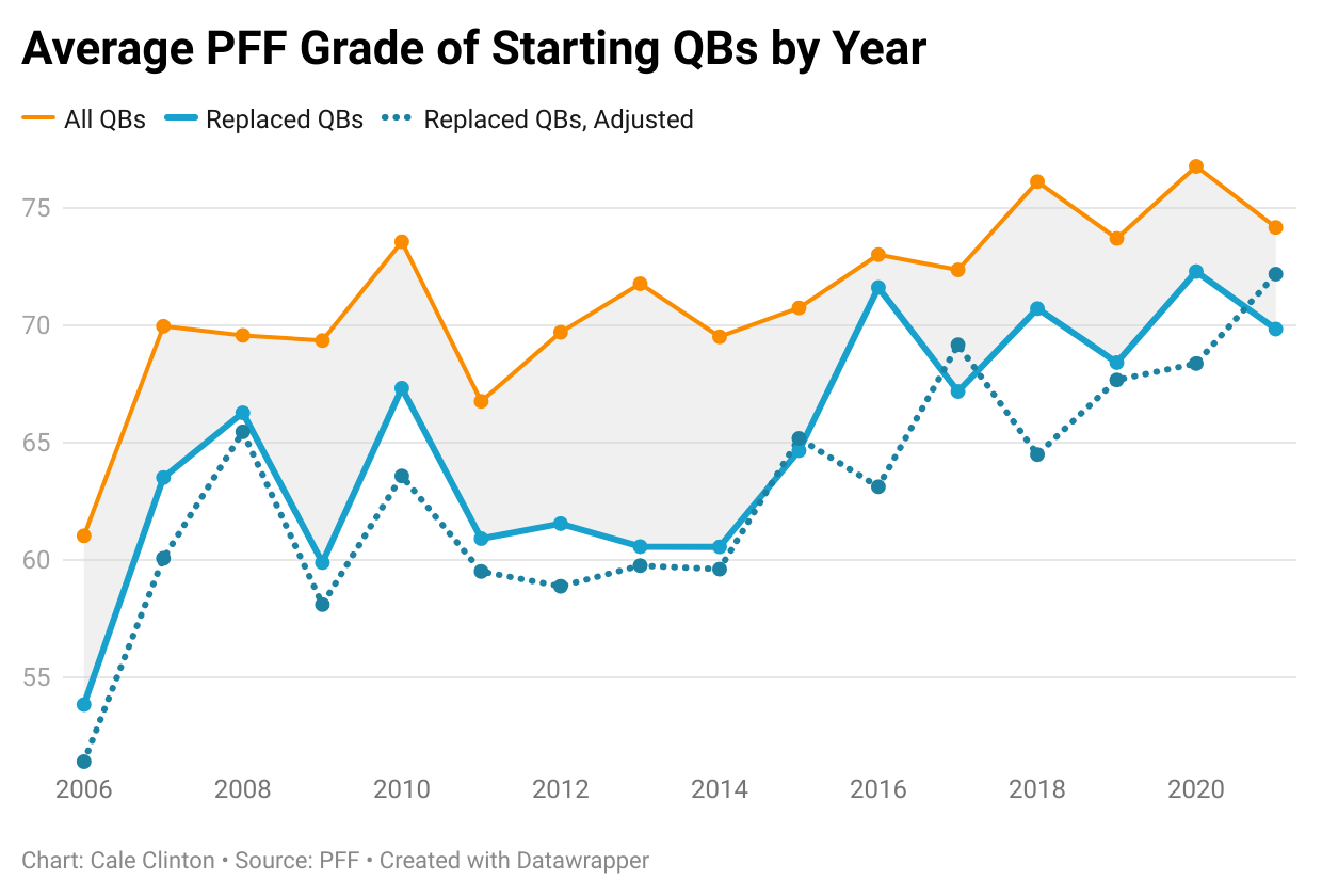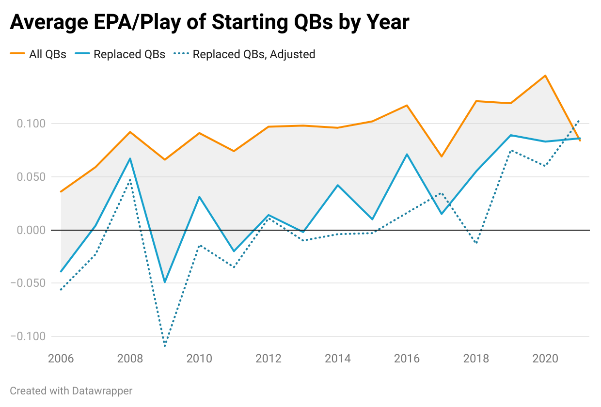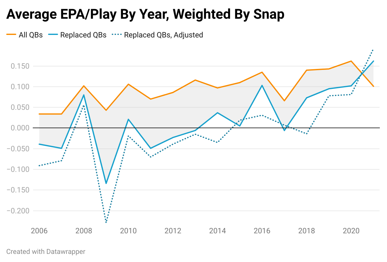 The standards for quarterback play have undeniably risen across the league. While there are still teams making poor quarterback decisions, and there is still a sizable gap between the average starting quarterback and the average replaced quarterback. However, we are now seeing capable, high-performing quarterbacks get moved by teams hoping to find something even better.