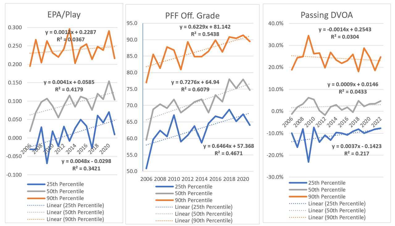 Our Passing DVOA model has by far the lowest correlation of our three statistics, which is to be expected. The number of controls and adjustments baked into DVOA, coupled with its focus on individual seasons, mean that the simple passage of time may not have the same correlation as it has with EPA/Play and PFF Grade. However, the DVOA graph gives us our most interesting output. The 90th percentile line trends downward at a rate of 0.14% per year, while the 25th percentile line trends upward at 0.37% per year. This narrowing in at the margins may suggest the spectrum of starting quarterback performance is shrinking, at least on a percentage basis. There is less separating the upper echelon of quarterback play from the bottom of the league. It is also fascinating to see, for a statistic with a built-in league average at 0.0%, just how high above zero our 50th percentile line finishes. That tracks in Football Outsiders’ data as well. In 2022, 34 quarterbacks qualified for FO’s quarterback DVOA ranking; 21 finished with a positive DVOA.