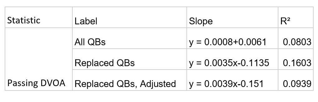 EPA/Play and PFF Grade are once again in lock-step. Passing DVOA, our outlier statistic throughout portions of this exercise, actually has the roles flipped. Replaced quarterbacks out-perform the team’s replacement at about the same rate, just reversed.