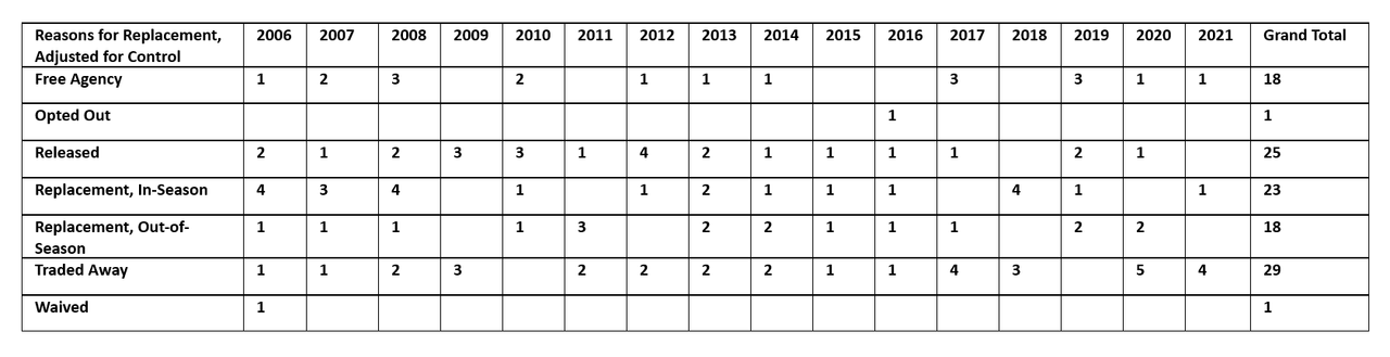 Of these categories, only four are outside the realm of control of a team’s coaching staff and front office: Injured, Injury Fill-In, Retired, and Other. Not only do these statistics represent scenarios where teams have no autonomy over the decision to change their starting quarterback, but they also happen independent of a player’s performance level. Any quarterback can suffer a season-ending injury or walk away from the game, while Injury Fill-Ins typically lose their job regardless of performance. Therefore, the ”replaced quarterbacks” label also has an “adjusted” subset, ruling out the labels that remove autonomy from the decision-making process.