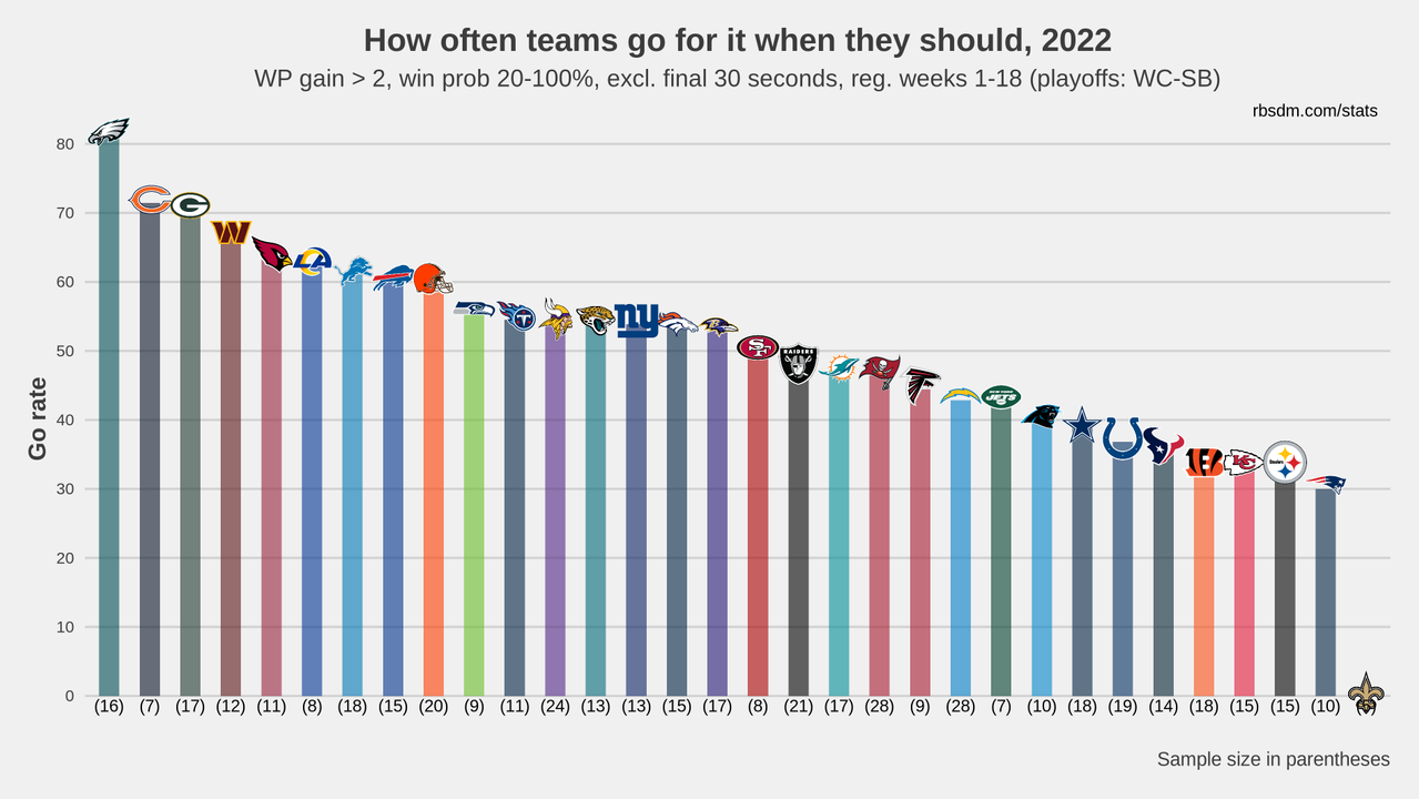 Coach Nick Sirianni has gone for it on 80% of the 4th-down opportunities that RBSDM.com's model said it was smart to go for it, by far the most in the NFL. He also will go for two when necessary and adapts his weekly offensive game plan to take advantage of opponent weaknesses. Simply put, Sirianni is one of the best coaches despite his opening press conference. His personal glow-up has been my favorite random postseason storyline. I loved him yelling at the sideline ref vs. the Giants and then staring back at the camera.