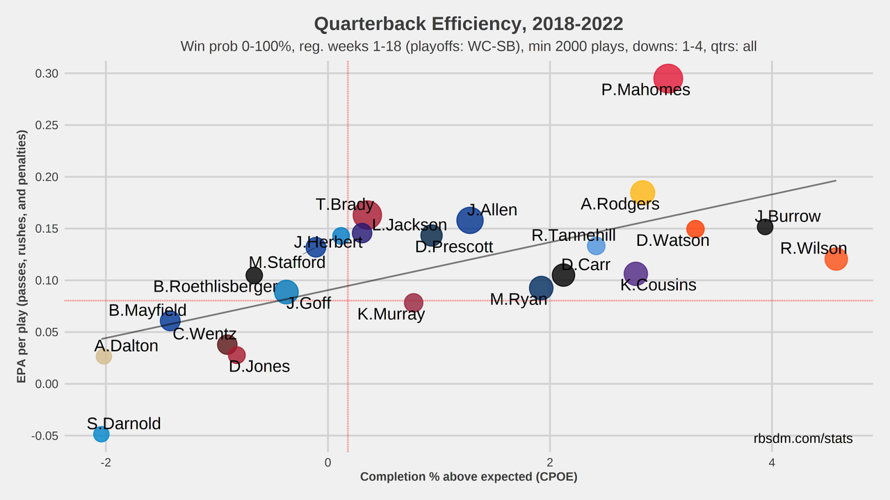 Jalen Hurts went from 18th to 4th in EPA/play this year. His accuracy improved (18th to 5th in CPOE). His turnover-worthy plays improved (30th to 2nd). His YPA in clean pockets improved (24th to 6th). Even his time to throw in clean pockets sped up (40th to 24th), which is a sign he's seeing the field better. Of course, it helps when Executive of the Year Howie Roseman swaps out Jalen Reagor's 5.2 YPT for A.J. Brown's 10.3 during the offseason. That move alone unlocked the ceiling of the offense, but Hurts deserves a ton of praise for consistently getting better despite an echo of "move him to RB" critiques. What a story. Impossible to root against.