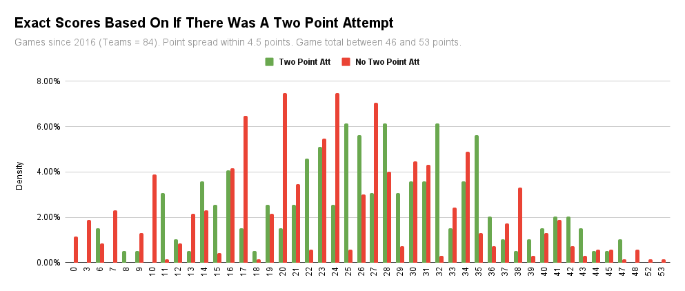 My last note is to look for some weird final scores here based on the Eagles' line of thinking. Philly was 31st in field goal attempts this year because of their 4th-down aggressiveness, and they went for two on four different occasions in the 4th quarter. Both are analytics-based decisions that can throw off traditional scoring numbers, something that probably isn't being properly accounted for with exact scores in those markets. I included how often each score happens based on if there was a two-point attempt below. Scores like 22, 25, 26, 28, and 32 catch my eye for Philly, hence my weird final score prediction above.