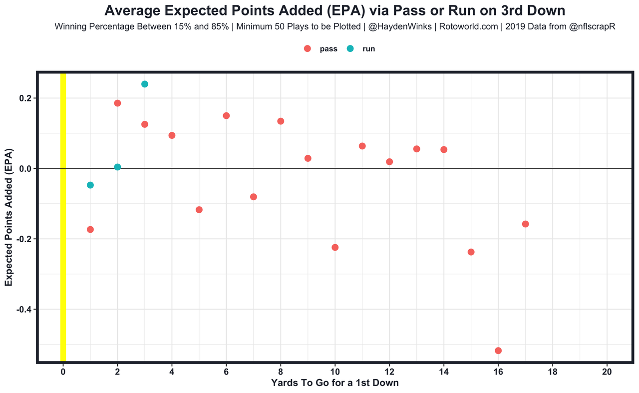 We'll get to Jalen Hurts' passing development later, but a large part of his value is in short-yardage situations. The Eagles led the NFL in both carries within three yards to go (7.3 per game) and in success rate on them (71%). Their RBs have been fantastic (69%, 2nd), but Hurts' ability to QB sneak or run when the other team knows its coming is almost Cam Newton like. Among 32 players with 30+ short-yardage carries, Hurts' 78% success rate is the best in the NFL. Knowing this, Philly can turn 3rd-and-mediums into two down territories to set up a short-yardage first down. Until the NFL's rules change, expect the Eagles' short-yardage QB package to be the most underrated attack in the game.
