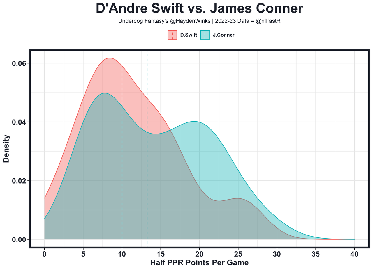 He had an ideal situation with the Eagles last year, but he underwhelmed. Swift finished as the 63rd overall player in fantasy points over replacement, while constantly tripping over himself in clear TD situations. His RB42 finish in fantasy points over expected was a sad outcome behind one of the best OLs in the NFL with a dual-threat QB around to open things up. While a schemed up receiver at times, Swift hasn't been a reliable third down option because of pass protection, something Roschon Johnson excelled at as a rookie. Throw in Khalil Hebert's better-than efficiency, and Swift could easily find himself in 3-RB committee on a likely average offense. There are too many other RBs in this range that have reached a fantasy ceiling Swift has been unable to hit in recent years. For example: