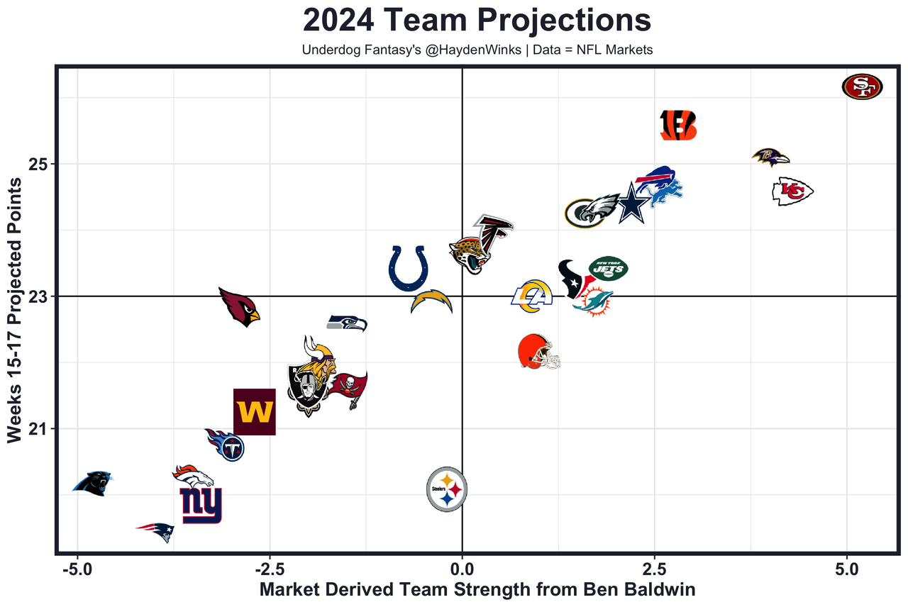 DeAndre Hopkins: Hand up. He was better than expected in 2023. Hopkins isn't in the old Larry Fitzgerald role yet. He won downfield with the Titans and continued to hold his own against man coverage. Hopkins' 78th percentile composite score equates to the WR21 overall, which is a lot earlier than his WR43 price tag despite the upcoming offense appearing far more modernized. The risk is Calvin Ridley coming over, but Ridley was worse in PFF grade, yards per route, and way first downs per route (47th percentile vs. 83rd percentile) than Hopkins was last year. The age cliff approaches both of these WRs, but if they replicate their 2023 film and numbers, it's Hopkins who has the advantage despite being drafted later than Ridley on Underdog Fantasy.