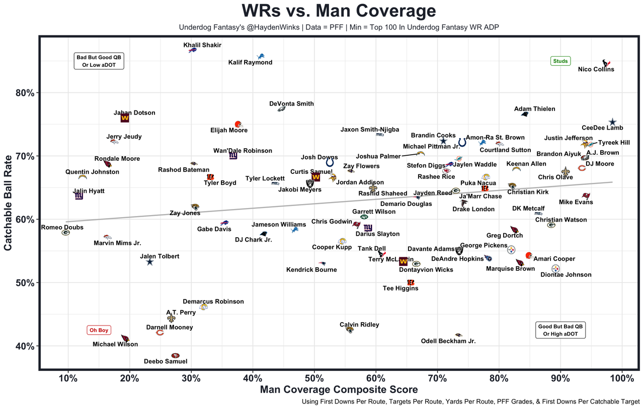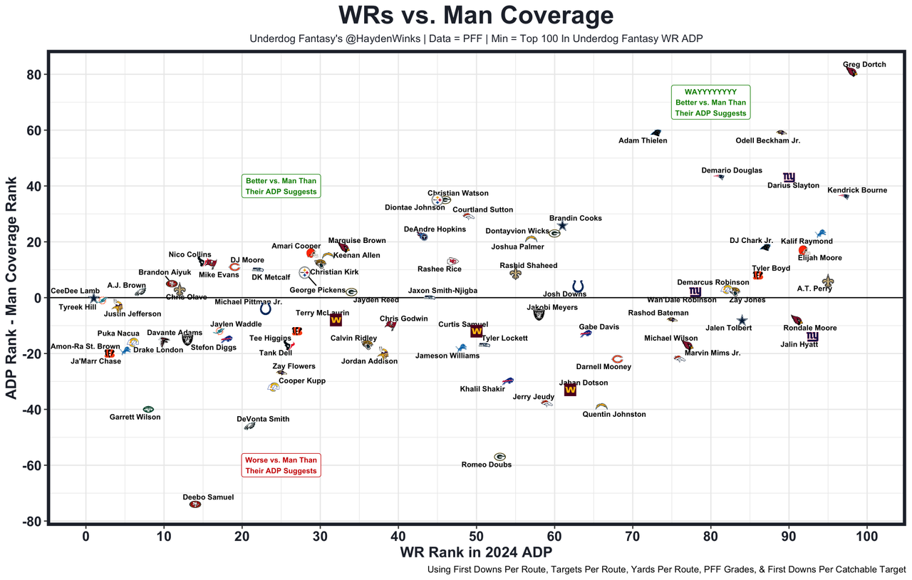 This chart ranks the players in composite man coverage score from their 2023 season and compares that ranking with where each WR is being drafted on Underdog Fantasy this upcoming season. Players below the black line on the chart were worse against man coverage than their 2024 ADP suggests, while players above the line were better than upcoming expectations. Of course, there is a varying range of context missing for each player. Let's get into it.