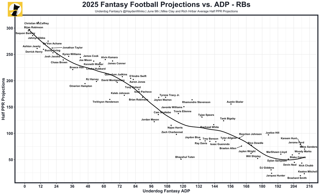 9. If we look at the early- and mid-round RBs, the worst picks in projected points happen to be the rookies. That's Ashton Jeanty among the Round 1 players, then Omarian Hampton, RJ Harvey, TreVeyon Henderson, and Kaleb Johnson afterwards. There's a couple things at play here. Most importantly, best ball drafters are looking for back-weighted production in these best ball tournaments. That's smart and reasonable. That said, best ball drafters also love a sexy looking team with theoretical upside, which partly explains the elevated price tags for rookies. It's not a surprise the season-long projections don't love the price tags, but I don't think that means they are all terrible picks either. The projections particularly find the Hampton and Henderson love a bit extreme... I agree.