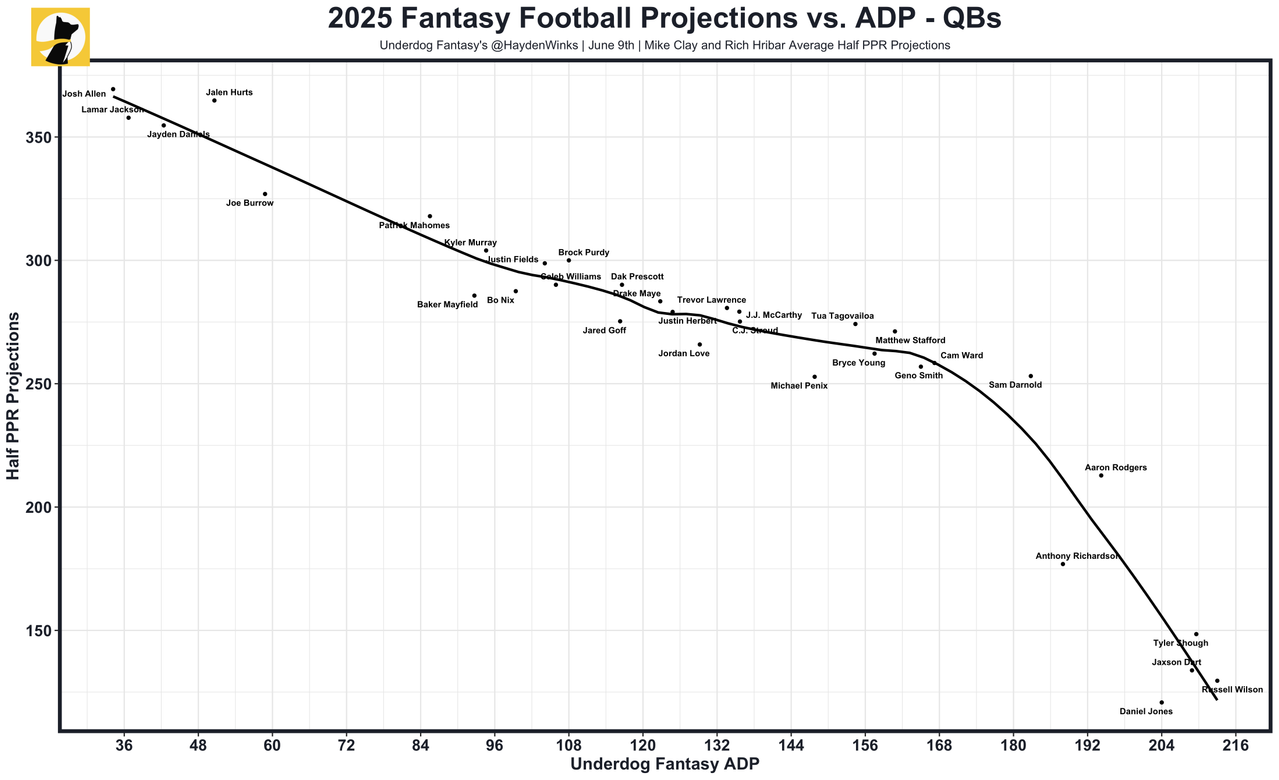 But I do think the niche best ball community has gone a bit too far with throwing away player projections, probably because almost nobody sits there and grinds through them. It's easier to vibes-based rankings, and it's easier to say "we just don't know." There's truth in these projections, even when thinking about the realistic odds of an upside scenario playing out. There's a reason why a site like Legendary Upside is simming seasons with player projections right now, and then releasing their research into why 3-QB builds and early-to-mid RBs are undervalued by the community. It's because the player projections say so. Ignoring them entirely is not the route I take, so let's see what our two experts spit out after going through things in May and June.