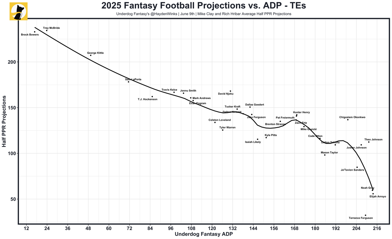 18. It's close, but both Mike Clay and Rich Hribar have Trey McBride above Brock Bowers in projected points. Their ADPs are flipped on Underdog.