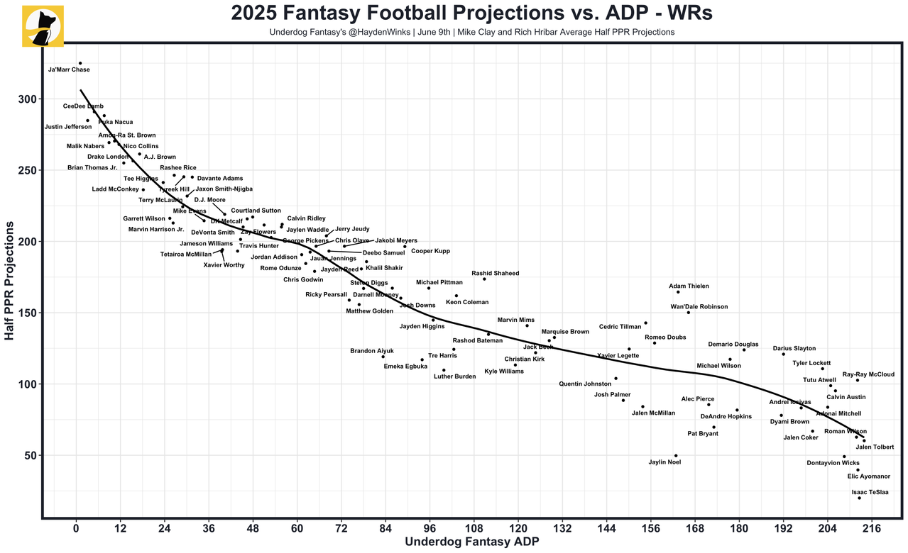 13. The most underrated early-round WR per these projections is Davante Adams. His single-game ceiling over the last two years remains elite, as was his 2024 finish on the Jets despite not getting into town until Halloween decorations were going up around neighborhoods.