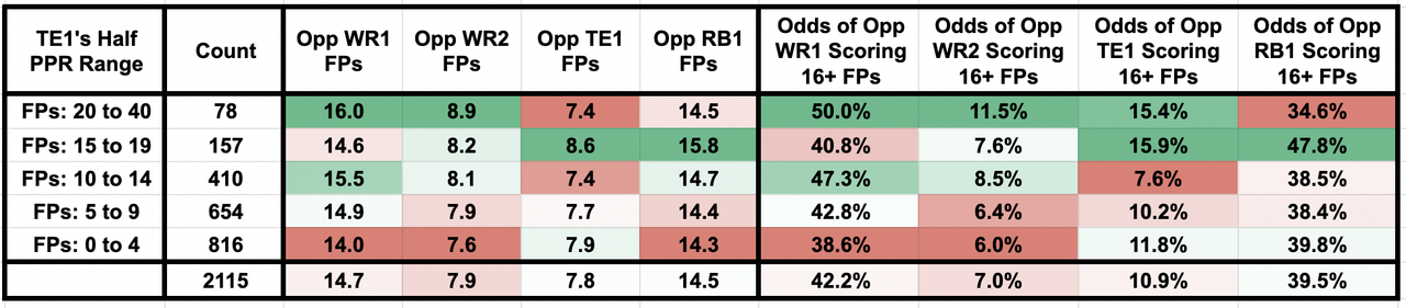 Correlation: TE1 to opposing WR1 (+0.00), to opposing WR2 (+0.04), to opposing TE1 (+0.04), and to opposing RB1 (+0.02) if we split the sample to TE1s with more than 10.0 half PPR points (aka ceiling games only).