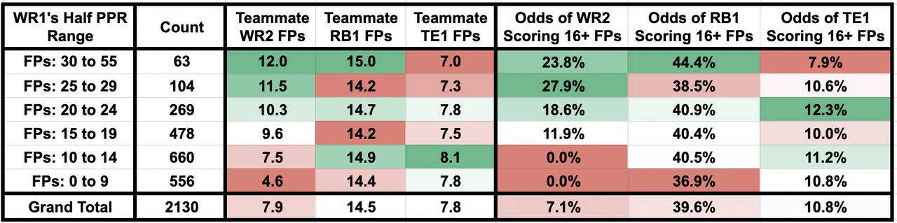 Correlation: WR1 to WR2 (+0.16), to RB1 (+0.01), and to TE1 (+0.02) if we split the sample to WR1s with more than 15.0 half PPR points (aka ceiling games only).