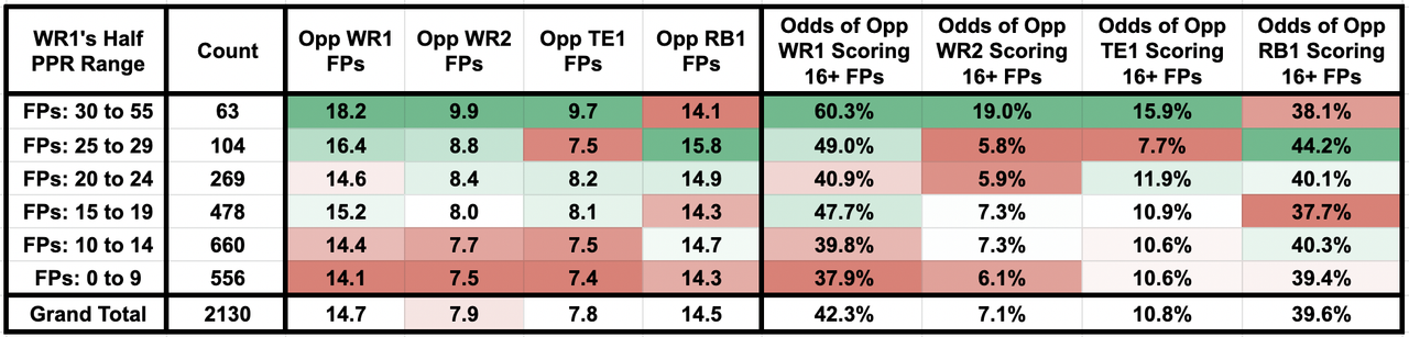 Correlation: WR1 to opposing WR1 (+0.09), to opposing WR2 (+0.10), to opposing TE1 (+0.01), and to opposing RB1 (+0.03) if we split the sample to WR1s with more than 15.0 half PPR points (aka ceiling games only).