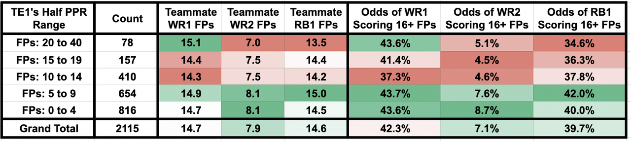 What definitely makes sense to me (and is confirmed by the data) is the TE1s being negatively correlated with his second-highest scoring WR teammate in a given week. When a TE1 scores 15+ half PPR points, his WR2 teammate only scores 7.3 half PPR points and only has a 4.7% chance of scoring more than 16 fantasy points, both are below average. There are only so many passing yards and passing touchdowns to go around, so it’s best to stack a TE with only one of his WRs.