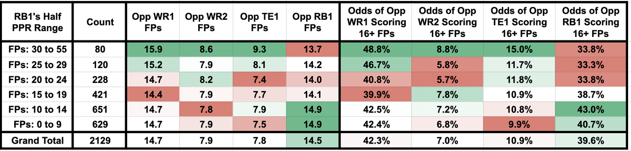 Correlation: RB1 to opposing WR1 (+0.07), to opposing WR2 (+0.03), to opposing TE1 (+0.08), and to opposing RB1 (+0.01) if we split the sample to RB1s with more than 15.0 half PPR points (aka ceiling games only).