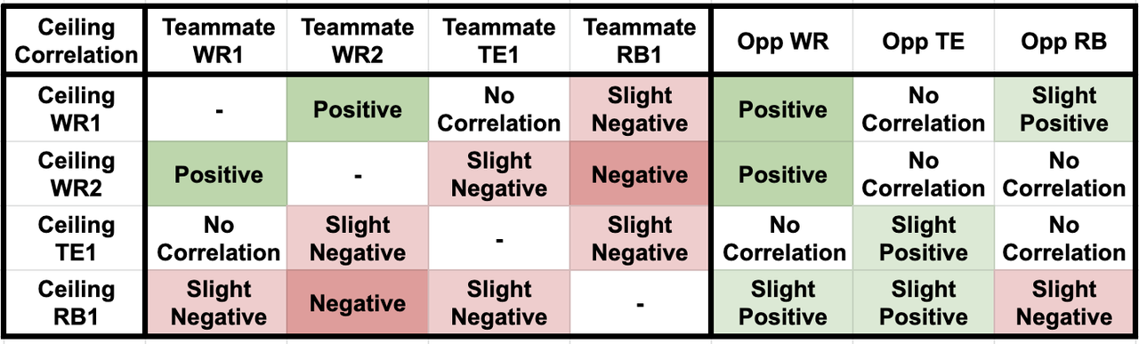Like mentioned in the TE1 correlation section, there’s not much WR1 and TE1 correlation. Perhaps there’s a tiny bit of negative correlation when a WR1 goes nuclear, but for the most part it’s fine to stack a WR1 with a TE1. You’re not going to make or break your roster either way.