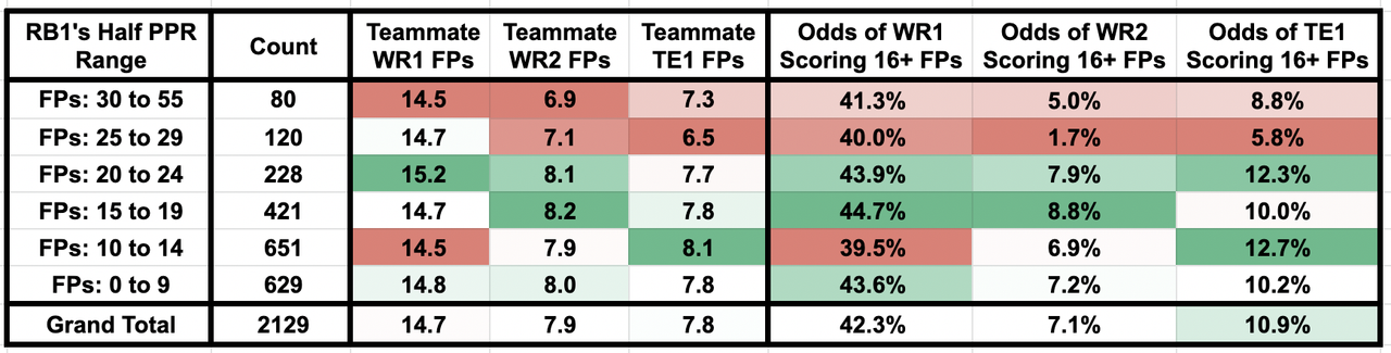 Correlation: RB1 to WR1 (-0.02), to WR2 (-0.11), and to TE1 (-0.05) if we split the sample to RB1s with more than 15.0 half PPR points (aka ceiling games only).