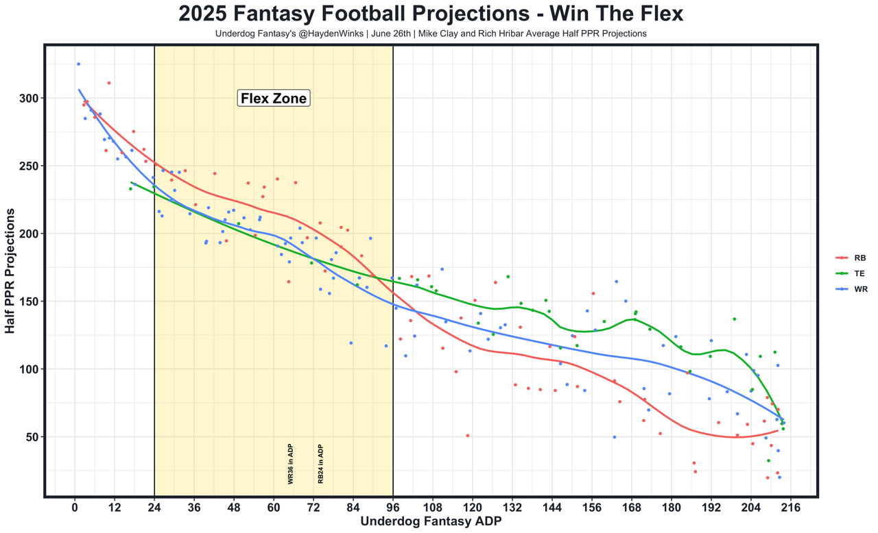 But that's not how it looks in this 2025 ADP environment. I took the projected half PPR points from Mike Clay and Rich Hribar and plotted them against Underdog Fantasy's ADP in 2025. As you can see in the Flex Zone (shoutout to Rae Sremmurd), there are RBs who project for about 50 more points than the WRs or TEs available for that flex job. If the RBs were priced up like they were 4 and 5 years ago, this chart looks different.