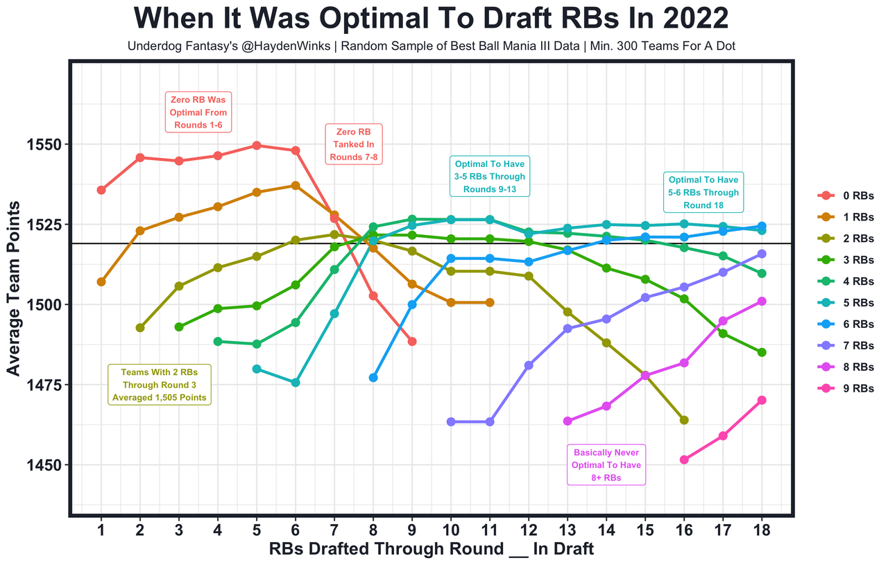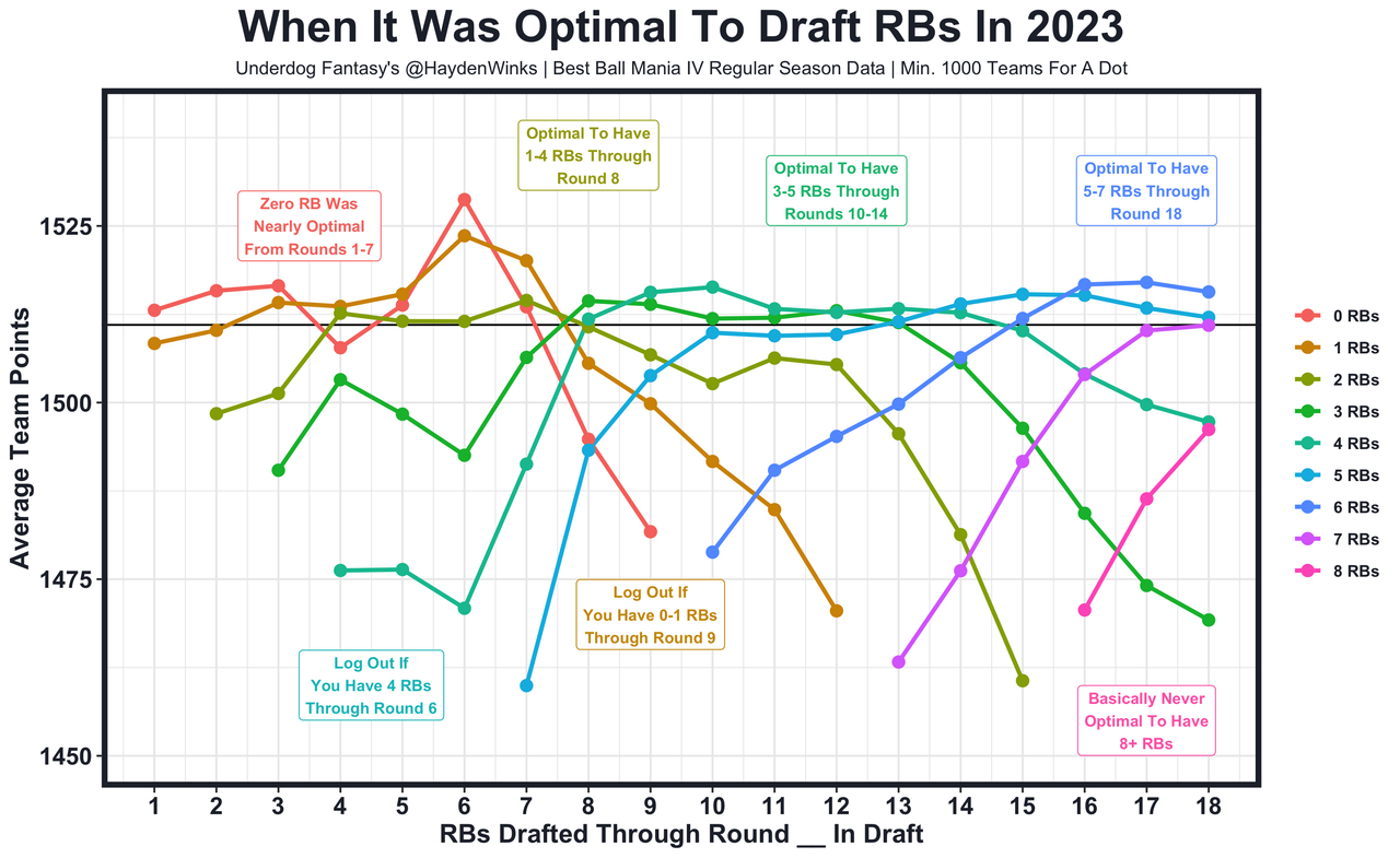 6 RBs Through Round 18: The optimal amount of RBs to have through the end of an Underdog Fantasy draft during both of these pure Zero RB years has been exactly 6. This falls at the upper bounds of my general advice of having 4-6 RBs, which once again checks out. We need to win with more quantity of RB picks when we don't invest into quality RBs early on. And it's interesting that in both of these years it's still been better to have 5 RBs compared to 7 RBs. In the seasons where early RB investments have shined, 7-RB teams have been really bad, so the general advice is to stick with 6 RBs after sprinting back into RBs in the middle rounds. This would line up with the projected fantasy points in the "Flex Zone" chart from above because RBs in Round 16-18 are typically horrific.