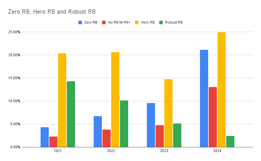 For those reasons, Zero RB is now popular. Rotoviz has an awesome best ball explorer tool, and Tom Strachan dug up just how dramatic Zero RB's rise in popularity on Underdog Fantasy over the last 4-5 years. His definitions in the chart above are: "Zero RB" = RB1 drafted exactly in Round 6, "0 RB till R6+" = RB1 drafted sometime after Round 6, "Hero RB" = RB1 in Rounds 1-3 but RB2 after Round 6, and "Robust RB" = RB3 through Round 4.
