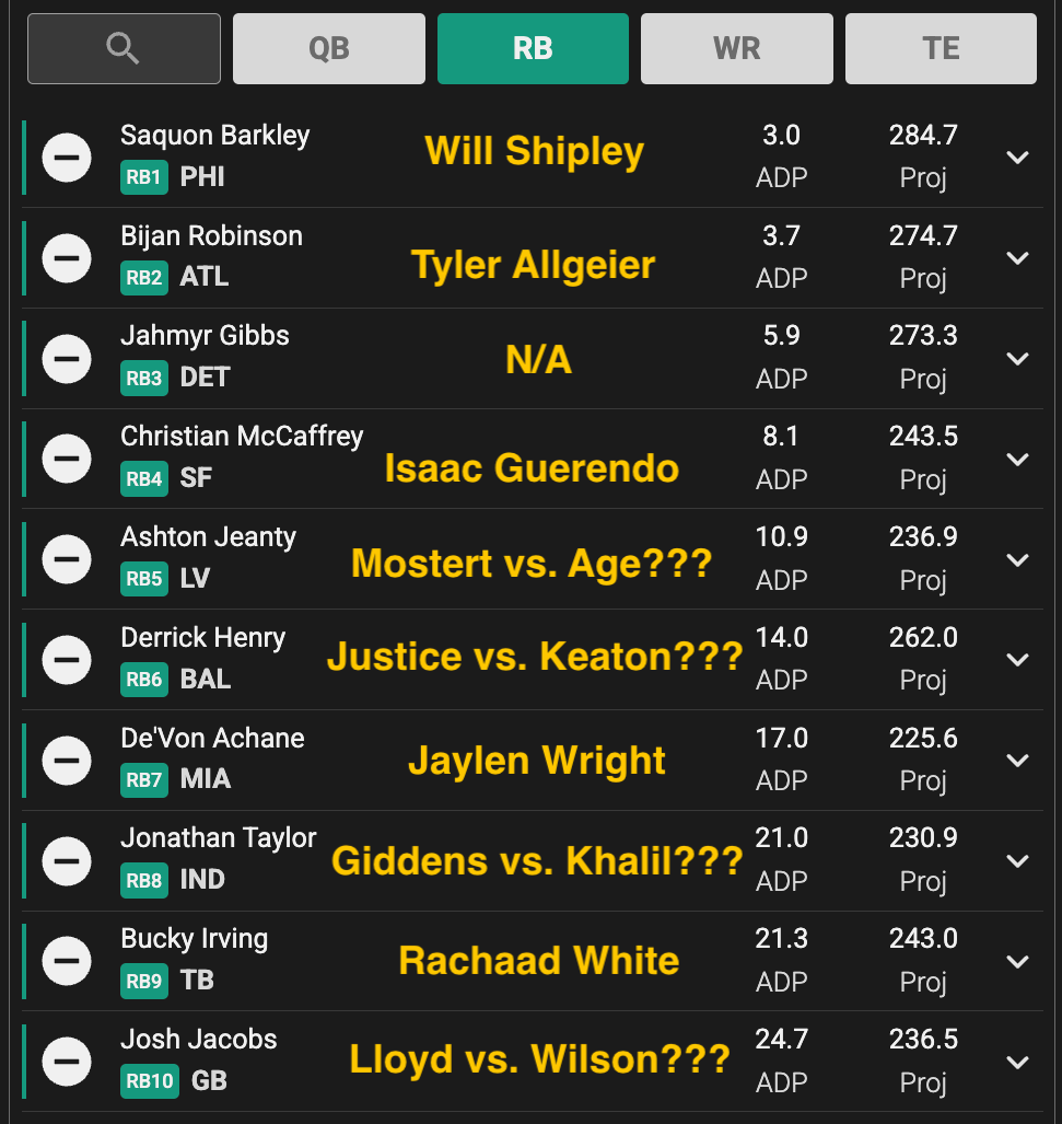 Round 5-7 RBs: Hubbard, Mixon, Walker, Kamara, Conner, Kaleb, Pacheco.