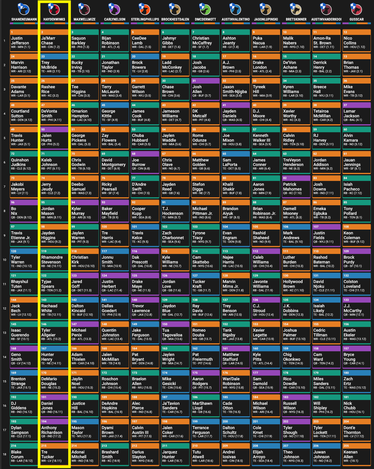 This is as close to an ideal Zero RB team for Underdog Fantasy in 2025, and it wasn't forced. A few things fell into my lap to justify the contrarian strategy: Ja'Marr Chase at 1.02, all the RBs going before 2.11, Rashee Rice falling to 3.02, and stacking Hurts and Smith at Round 4/5. If any of these things don't happen, I likely find a RB value before Round 6, but something like this happens naturally in 1-in-10 drafts or so. Now I feel very prepared to draft this styled team as a change up.