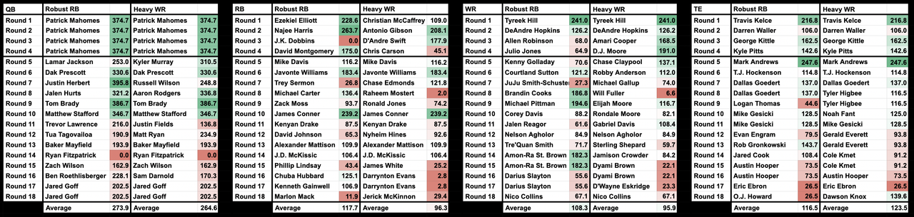 The table above shows which player was the most-commonly drafted in each round, at each position, and by each type of build. “Robust RB” was defined as having at least three (3) RBs through Round 4, and “Heavy WR” was having at least three (3) WRs through Round 4. I’ll call Heavy WR “Zero RB” throughout the column because it’s close enough and is the more common title. Plus it's good for clicks.