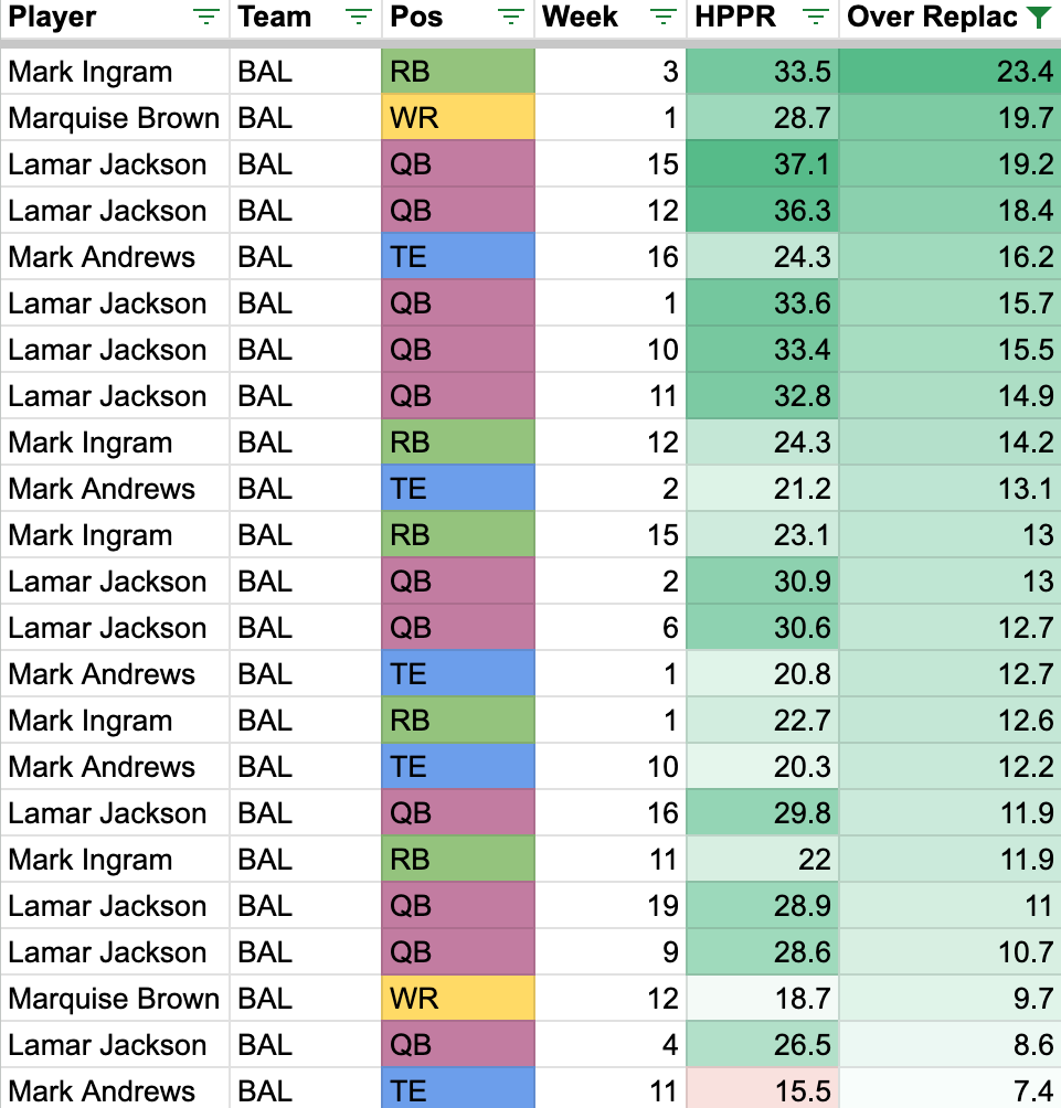 Because Lamar was going off all year, RB Mark Ingram had himself quite the season. Ingram had five (5) games with 10+ fantasy points over replacement including a +23.4 points over replacement spike week. In those five big Ingram games, Lamar averaged a bonkers +16.4 fantasy points over replacement at QB, so their spike weeks were positively correlated because of how outlier of a season this was. This level of correlation is unlikely to hold up in 2023 with a new OC and better pass catchers in general, but it's still crazy to see the data.