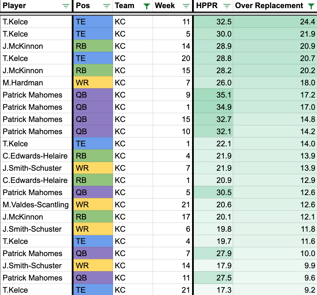 I won't write up this entire team, but Mahomes had four (4) games with a pass-catching double stack going for at least 5+ points over replacement and another six (6) games with a single stack popping off. Travis Kelce was included in all but one of these elite spikes. This sample gets wider if we include RB Jerick McKinnon, who is more correlated to Mahomes than the normal RB.