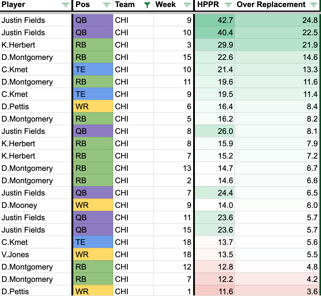Justin Fields finished as the QB5 and 41st overall player in fantasy points over replacement using Underdog Fantasy's Half PPR and weekly scoring format. As you see in the chart above, Fields had two massive 40+ point games in Week 9 and Week 10, ultimately creating 24.8 and 22.5 fantasy points over the typical fantasy QB12 score in a given week. Spike weeks like that are why Fields is a 3rd or 4th round pick in best ball tournaments.