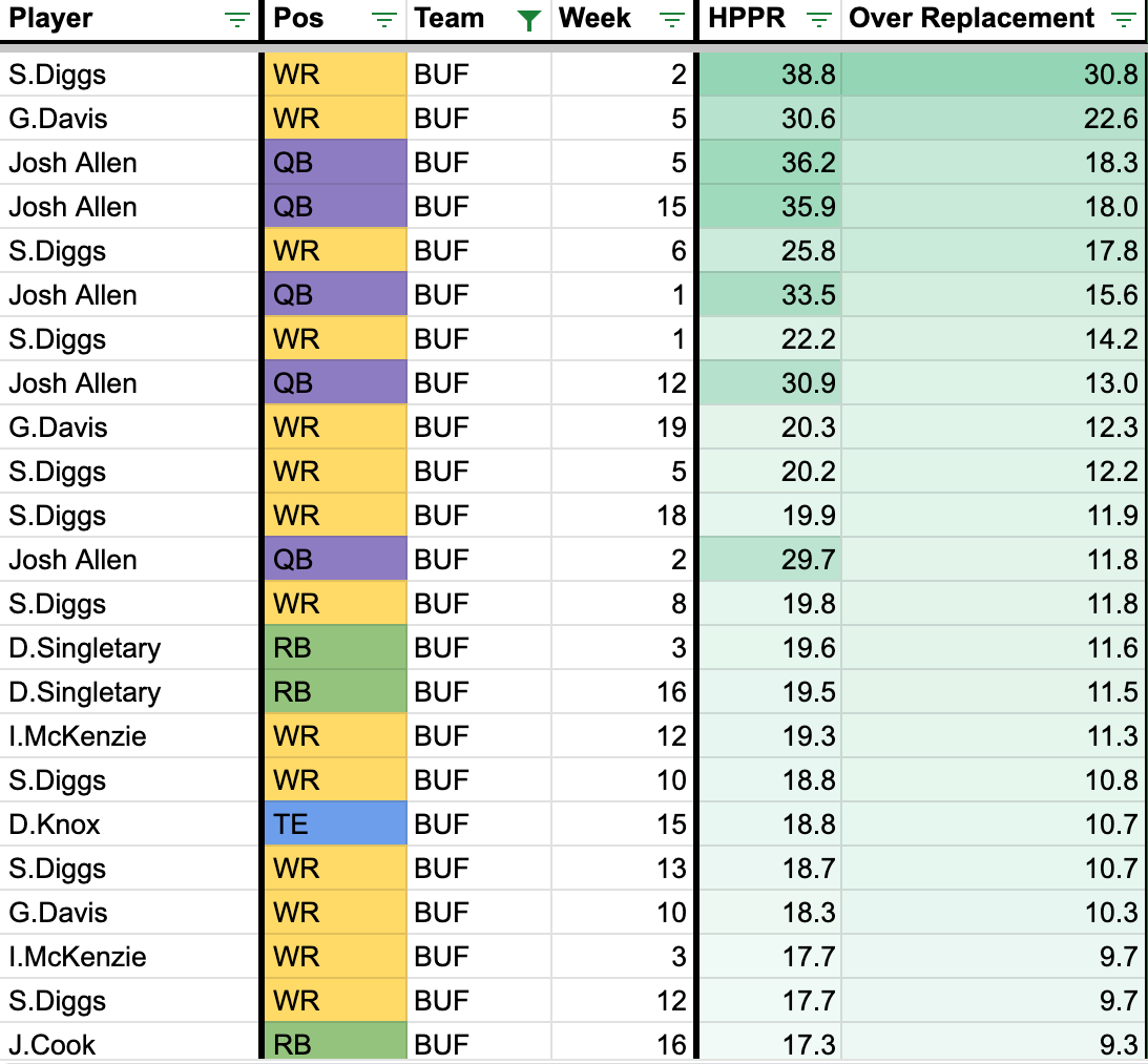 Beyond that, Dawson Knox had one (1) spike weekm Isaiah McKenzie had two (2), and the RBs sprinkled in for six (6) in total, with Devin Singletary edging out James Cook, 4-2.