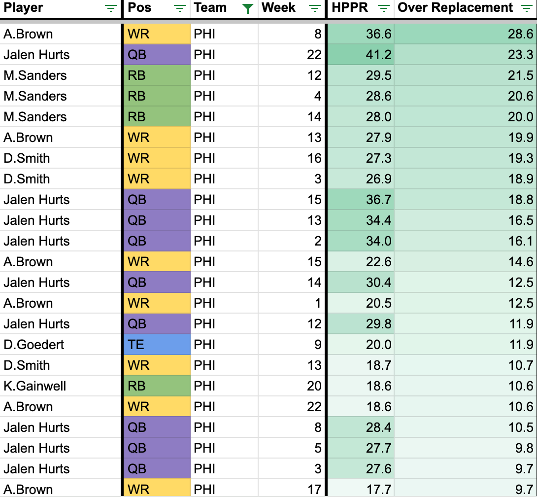 Including the NFL Playoffs last year, Hurts had 12 games of 5+ fantasy points over replacement with even Gardner Minshew adding another spike week in a spot start. Hurts had four (4) monster games with 15+ FPOR, which is why he goes so high in best ball. In three of these elite games, Hurts brought both Brown and Smith along for 5+ fantasy points over replacement. With how concentrated this offense is between these WRs, it's obvious that a double stack has some appeal. In fact, he had eight (8) games with a double stack spiking and another three (3) games with a single stack teammate hitting that 5+ point over replacement threshold. Whew.