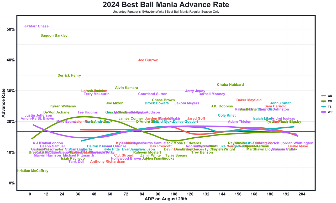 Joe Burrow (0% exposure) had a rare throwing-side wrist surgery, and he wasn't practicing fully in training camp. Turns out, it never impacted him. Burrow's price tag was far lower than it was when ever he's been healthy, and the stacking partners being so concrete made him extra enticing in best ball tournaments, where the best picks are often statue QBs who get hot with passing TDs. Burrow looked better than ever (more physical play making), and the defense's total collapse created weekly shoot outs. Ja'Marr Chase set a new Best Ball Mania record for highest advance rate (51%), and I didn't have the Burrow-to-Chase connection at all. As for Chase, his hold out didn't impact him throughout the regular season either. The training camp holdout is something we're still figuring out it's importance, as Brandon Aiyuk struggled to get going early.