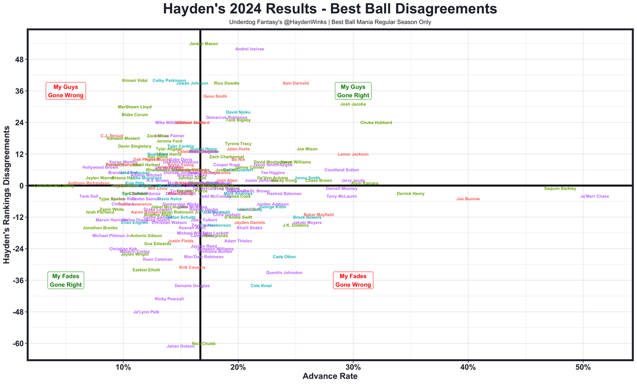 Best Narrative: Improving RB Environments. This is nearly not an exaggeration. All of the best picks were veteran RBs going from bad offenses to good ones. Saquon Barkley (48% advance rate), Derrick Henry (35%), Josh Jacobs (30%), and Joe Mixon (26%). Even Aaron Jones (18%) and Tony Pollard (19%) held the line. Ironically, the narrative around Zero RB in NFL terms is that the environment explains a bulk of the RB's production, but the fantasy community opted to largely ignore the inverse of that theory here. Not only did these back rack up fantasy points, but they also finished 1st, 2nd, 9th, and 13th in NextGenStats' Rush Yards Over Expected.