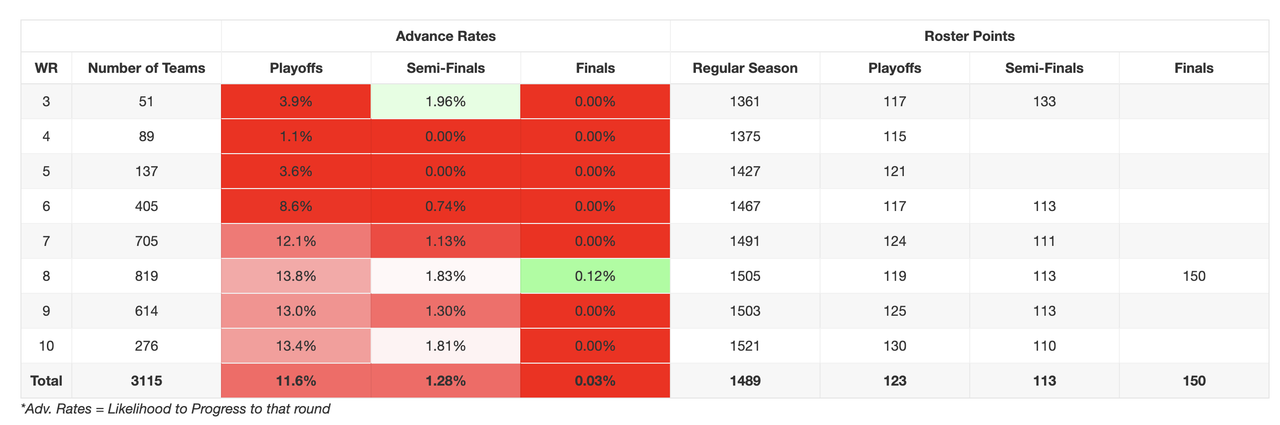 Using Rotoviz’s Underdog Roster Construction Explorer we can examine how the strategy has faired over Bestball Mania II and III, by adjusting the inputs to show us results based on a team not selecting their WR1 until after round six (pick 72).