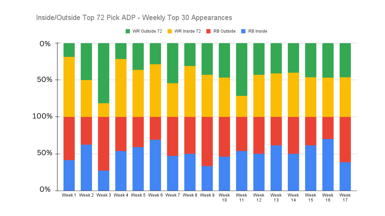 This table shows us that if we dive into the top 30 Weekly Non-QB scorers, remove tight ends, who rarely make an impact and break it down by ADP to represent those inside the top 72 picks in ADP and those outside of that, how often they were contributing big performances. Each bar represents a percentage of the weekly top 30 scorers that a group of players was drafted in.