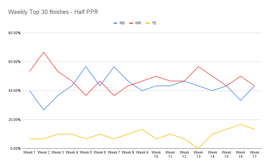Wide receivers picked inside the top 72 picks made up the majority of wide receivers scoring inside the top 30 on 13 out of the 17 fantasy-relevant weeks, with one week resulting in a tie and three where the wide receivers picked after pick 72 represented the majority. Here it’s far clearer that the wide receivers drafted inside the top 72 consistently performed well.