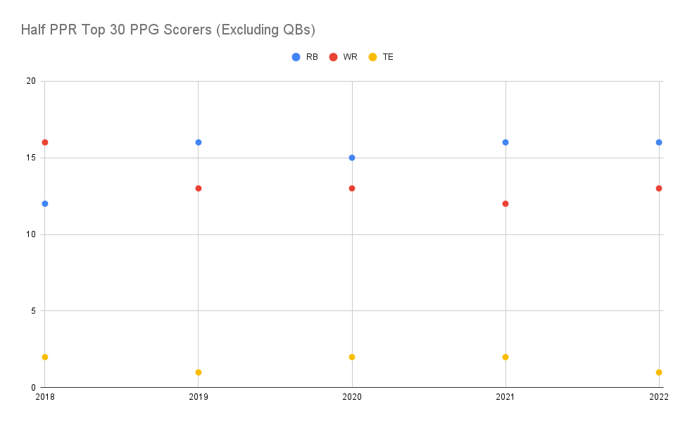 In Half PPR formats scoring between running backs and wide receivers has been pretty similar over the last five years, with running backs making up more of the top 30 points total points scorers than wide receivers in that time. The table below shows us that and tells us that the end-of-season results aren’t too dissimilar at the very least.