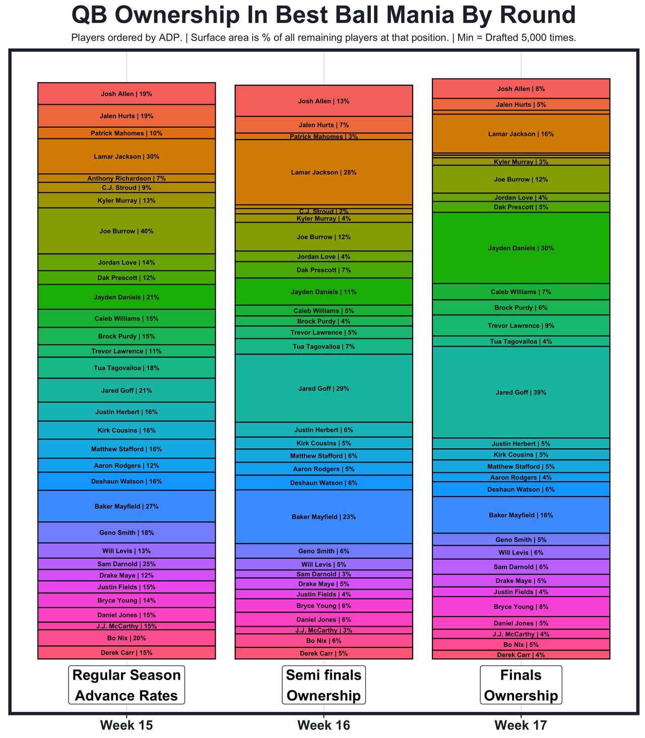 The QB10 in ADP finished as the QB5 in fantasy points over replacement during the regular season, and then finished as the QB1 throughout the fantasy playoffs (30.9 points per game). Daniels was as advertised as a rusher, setting the all time record for most rushing yards by a rookie QB. And he did so on the 2nd-best success rate among QBs with 300+ rushing yards (only trailing Drake Maye ironically). Daniels' arm talent was on display and the concerns about throwing over the middle were quickly thwarted by ... Kliff Kingsbury's scheme??? Yuppp. Daniels should run away with the rookie of the year, and he should get more skill talent around him next year. We've added another elite athlete to the Elite QB discussion. Welcome to Round 3/4 of fantasy drafts with the likes of Josh Allen, Lamar Jackson, and Jalen Hurts.